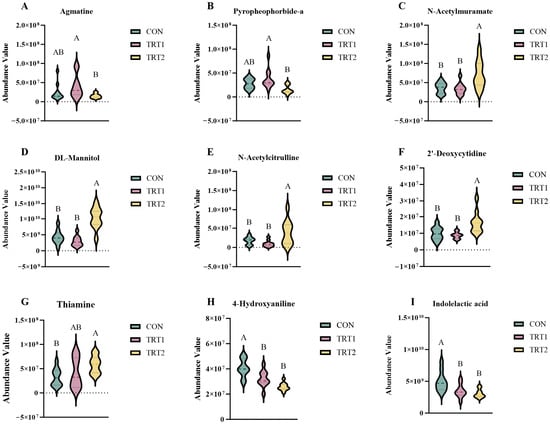 The metabolites with highly significant differences in the KEGG pathway are shown in Figure 6 and Table S5. The results showed that the levels of Agmatine and Pyropheophorbide-a in the TRT1 group were significantly higher than those in the TRT2 group (p < 0.01; Figure 6A,B). However, N-Acetylmuramate, DL-Mannitol, and N-Acetyleitrulline were lower than those in the TRT2 group (p < 0.01; Figure 6C–E); 2′-Deoxyeytidine and Thiamine in the TRT2 group were highly significantly increased (p < 0.01; Figure 6F,G); Compared with the CON group, the levels of Indolelactie acid and 4-Hydroxyaniline in the TRT1 and TRT2 groups decreased (p < 0.01; Figure 6H,I).