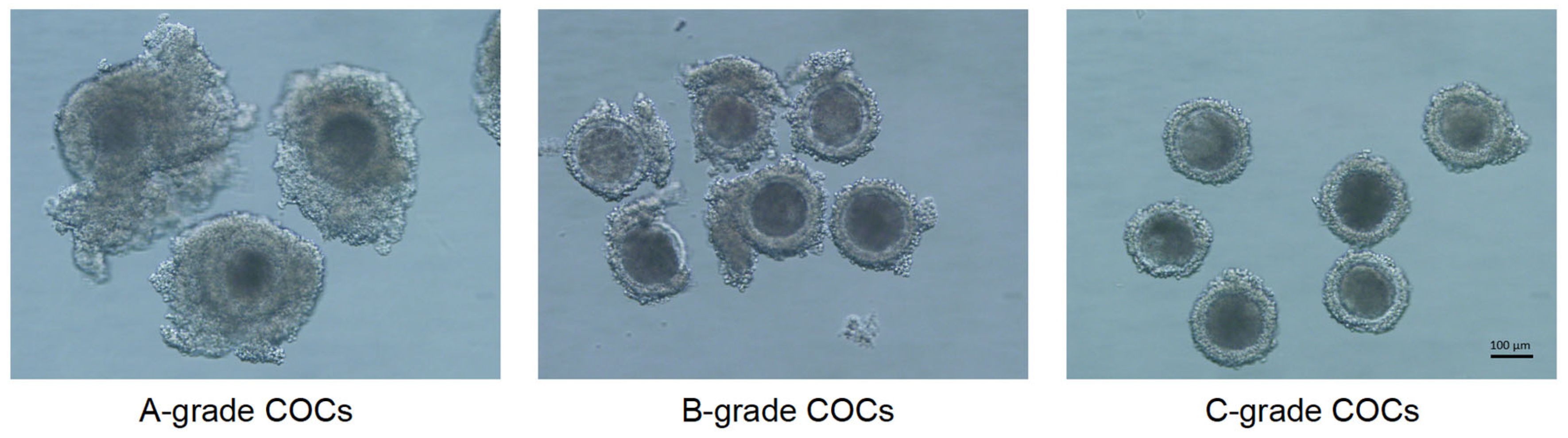 | No. grade C COCs | 6.86 ± 1.06 a | 5.70 ± 1.13 b | 6.90 ± 1.20 ab | 7.71 ± 1.36 a |