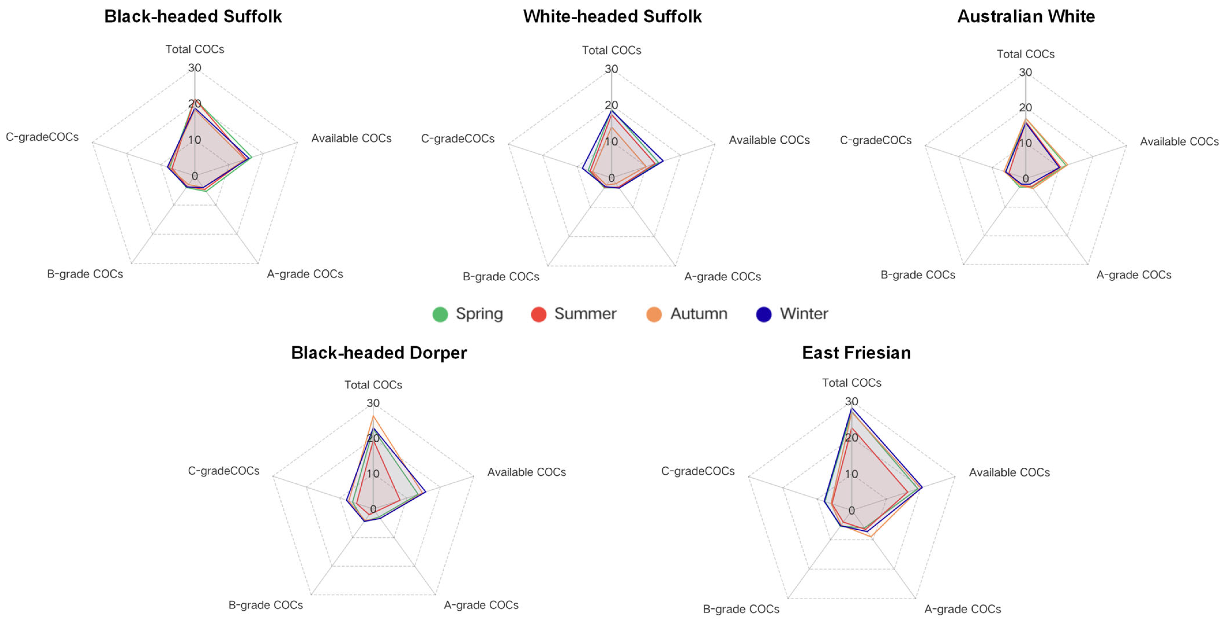 | Total available COCs per ewe | 15.57 ± 2.50 ab | 12.93 ± 2.40 bc | 10.93 ± 1.38 c | 13.38 ± 4.98 bc | 18.69 ± 3.04 a |
