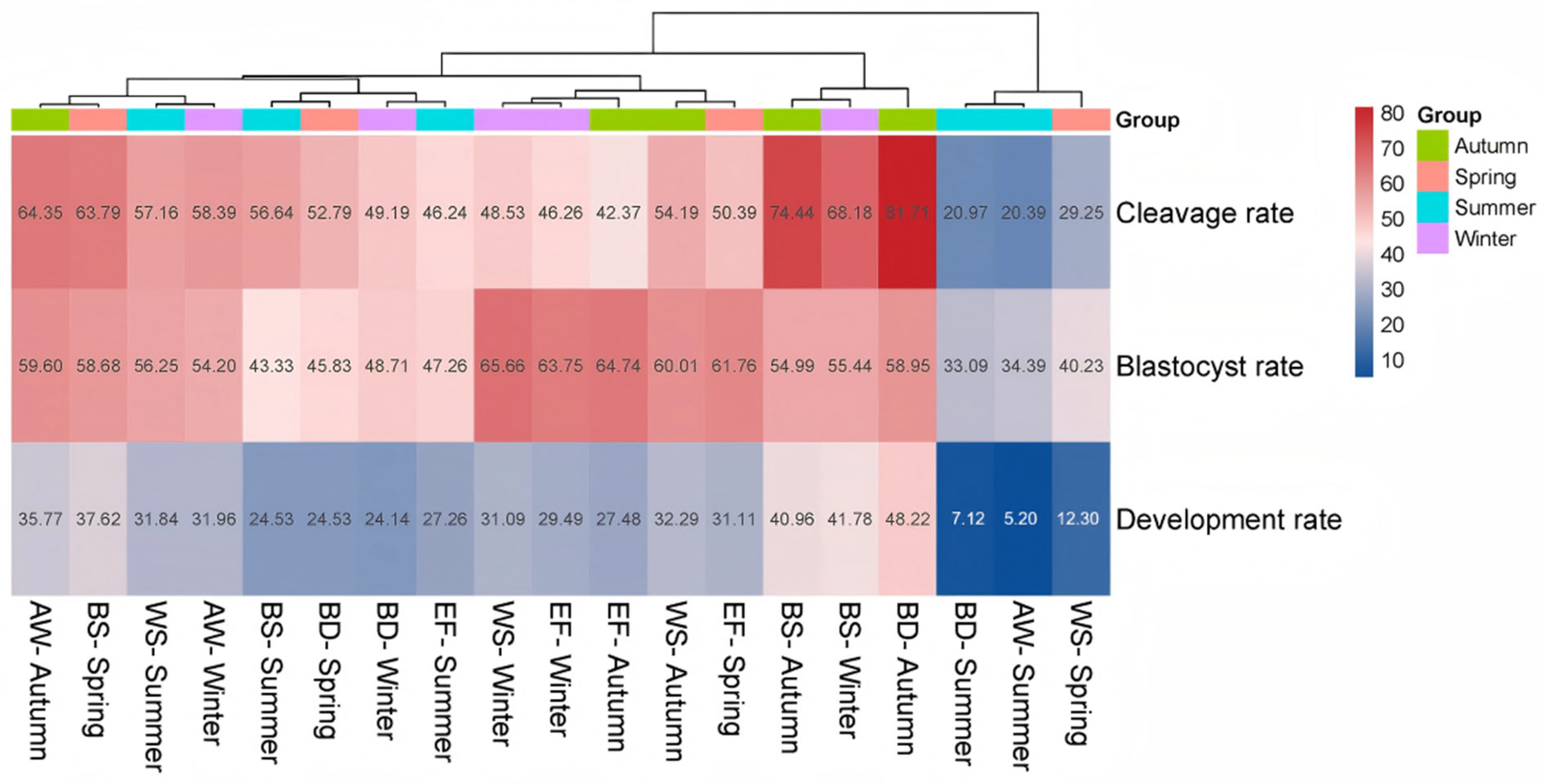 | Blastocyst rate (%) | 52.66 ± 12.47 ab | 52.66 ± 12.47 b | 59.02 ± 4.83 a | 57.54 ± 8.71 a |