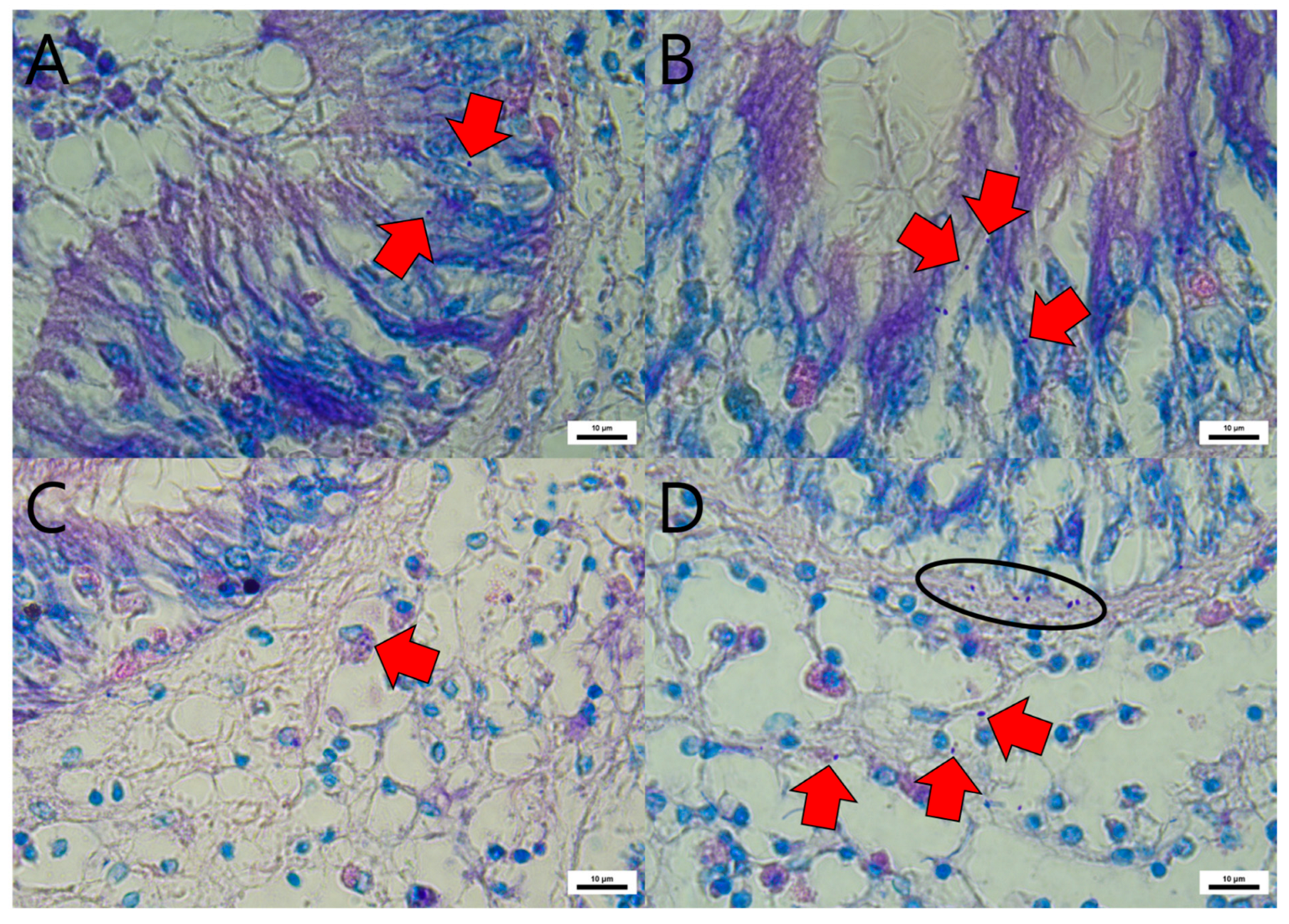 Figure 1. Histopathological observations of Manila clams after experimental EHP exposure via 1-day immersion, stained with Giemsa and EHP (red arrows) observed in the cytoplasm of the midgut epithelium (A,B), Hemocyte engulfing EHP (red arrow) in the connective tissue beneath midgut epithelium (C), EHP beneath the epithelial cells (ellipse) of midgut and disseminated in connective tissue (D).