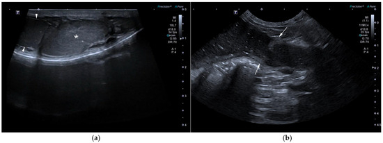 Abdominal ultrasound (AUS) of case 1: (a) Oblique view of a uterine horn (arrowheads) within the scrotum, with the testis in the center (asterisk) and the epididymis on the right side of the image; (b) Longitudinal view of the caudal aspect of the uterus masculinus (UM) showing a focal cervix-like mural narrowing ventral to the descending colon (arrows).