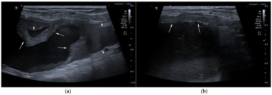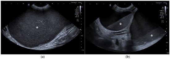 AUS in all three dogs revealed a fluid-filled cavitary structure originating in the caudal peritoneum between the colon and urinary bladder and extending cranially through the mid-abdomen, causing a mass effect. In cases 1 and 2, the lesion continued bilaterally as paired, thin tubular extensions coursing caudally through the inguinal rings adjacent to each testis (Figure 1a). In case 1, a focal mural narrowing resembling a uterine cervix was noted caudally (Figure 1b). The wall was thin and smooth in case 1, while in case 2 it was irregular, especially in its caudal aspect (Figure 2a,b). No information was available regarding the course of the UM horns or wall appearance for case 3. The luminal content consisted of echogenic, inhomogeneous fluid in all cases (Figure 3a); in case 2, sedimentation created fluid–fluid levels (Figure 3b).