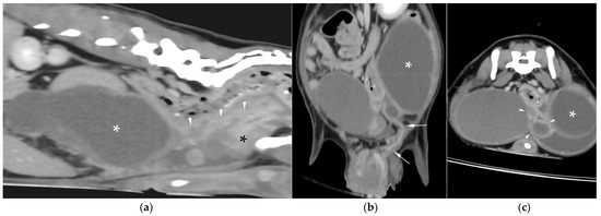CT of case 2: (a) Slightly oblique longitudinal view showing the UM, extending from the prostate gland (black asterisk), not distended at this level (white arrowheads), through the mid-caudal abdomen, where a more distended portion of the UM (white asterisk) is identified. Ventral to it, there is a scant volume of peritoneal free fluid; (b) Dorsal view showing the UM (asterisk) on the left, with caudal extension of the left uterine horn through the inguinal ring into the scrotum (arrows), and the urinary bladder positioned on the right; (c) Transverse view depicting the urinary bladder on the right and three transverse sections of the UM (asterisk) on its left, surrounded by free peritoneal fluid. The two UM sections closest to the prostate show mild distention and irregular wall thickening (arrowheads).