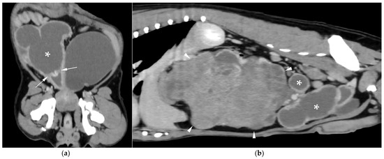 CT of case 3 (a) Dorsal oblique view showing the UM (asterisk) on the right, with a cervix-like mural narrowing (arrows) and cranially extending paired uterine horns. The urinary bladder is positioned to the left, and the prostate lies caudal to them; (b) Parasagittal view demonstrating a large right-sided cranial peritoneal mass (arrowheads) with multiple sections of the UM (asterisks) caudal to the mass.