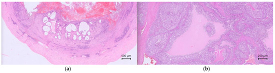 Histopathological images of case 3, hematoxylin-eosin staining. (a) 2× magnification. Tubular organ showing an outer circumferential muscular layer (myometrium) and an inner mucosal layer with dilated glands (endometrium). Cellular debris and hemorrhage are present within the lumen; (b) 5× magnification. Granulosa cell tumor composed of neoplastic cells forming irregular cystic cavities with central follicular fluid and peripheral clusters of neoplastic cells, resembling tertiary ovarian follicles.