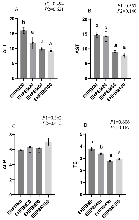 Plasma biochemistry. Statistical significance between groups is indicated by differing superscripts. (A) ALT; (B) AST; (C) ALP; (D) TC; (E) TG; (F) GLU. p1: the average of the p-values from the Shapiro–Wilk tests for each group; p > 0.05 indicates that the data follow a normal distribution. p2: p-value of the Levene’s test; p > 0.05 indicates that the data meet the assumption of homogeneity of variances.