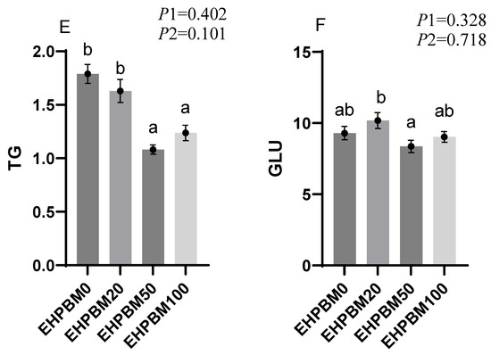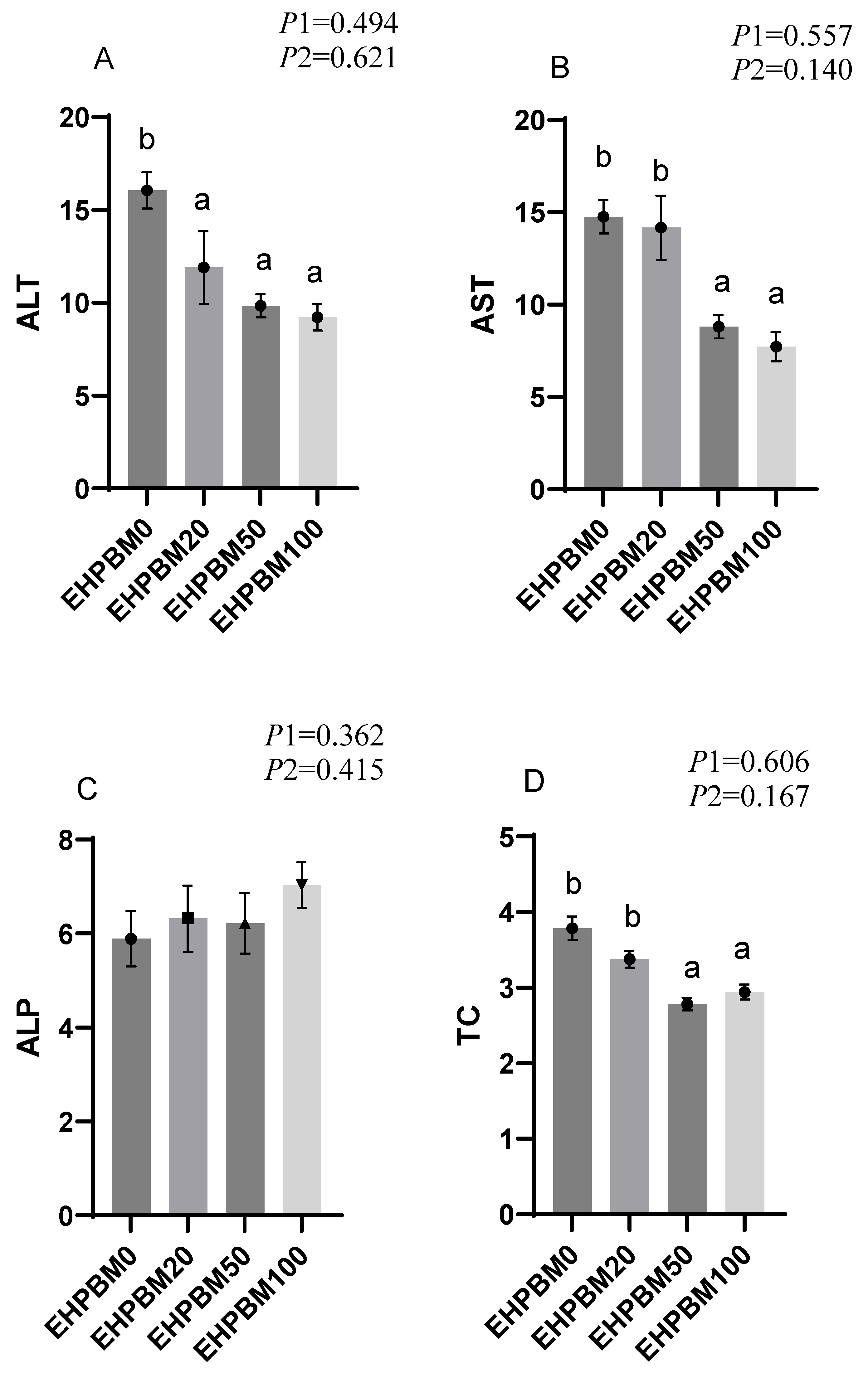 The results of plasma biochemistry can be seen in Figure 1. Both EHPBM50 and EHPBM100 groups significantly reduced AST levels (p < 0.05). Similarly, TC and TG levels of these two groups were also markedly decreased compared to the control group (p < 0.05). However, serum GLU levels showed no significant differences compared to the control group (p > 0.05). Notably, EHPBM substitution significantly lowered serum ALT levels across replacement levels (p < 0.05).