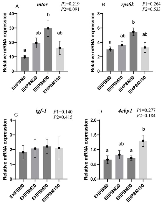 Figure 2 presents expression profiles of four protein metabolism-related genes under different substitution levels of EHPBM replacing fishmeal. In the group of EHPBM50, significant upregulation is observed in the expression of mtor and rps6k compared with the EHPBM0 group (p < 0.05). In the EHPBM100 group, the expression level of 4ebp1 shows marked upregulation compared with the EHPBM0 group (p < 0.05). Notably, EHPBM supplementation demonstrates no significant regulatory effect on igf-1 expression (p > 0.05).