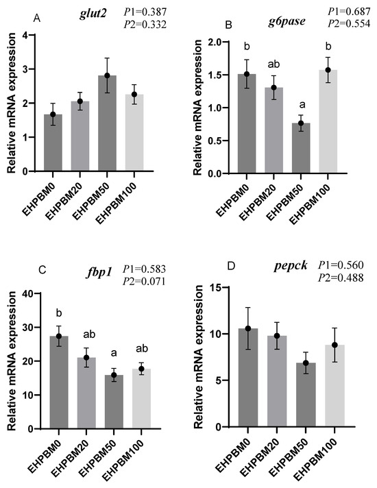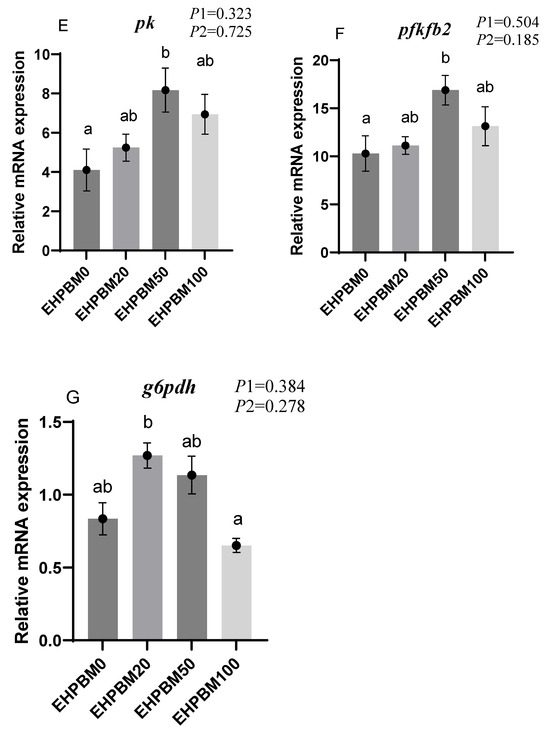 Figure 3 presents the expression profiles of glucose metabolism-related genes under varying substitution levels of EHPBM replacing fishmeal. In the EHPBM50 group, g6pase and fbp1 exhibited significant downregulation, while pk and pfkfb2 demonstrated marked upregulation compared with the EHPBM0 group (p < 0.05). Furthermore, compared to the control group, EHPBM supplementation revealed no significant alterations in glut2, pepck, or g6pdh expression levels (p > 0.05).