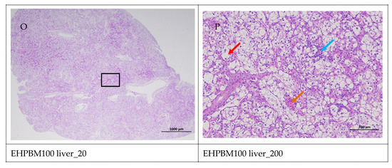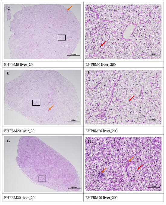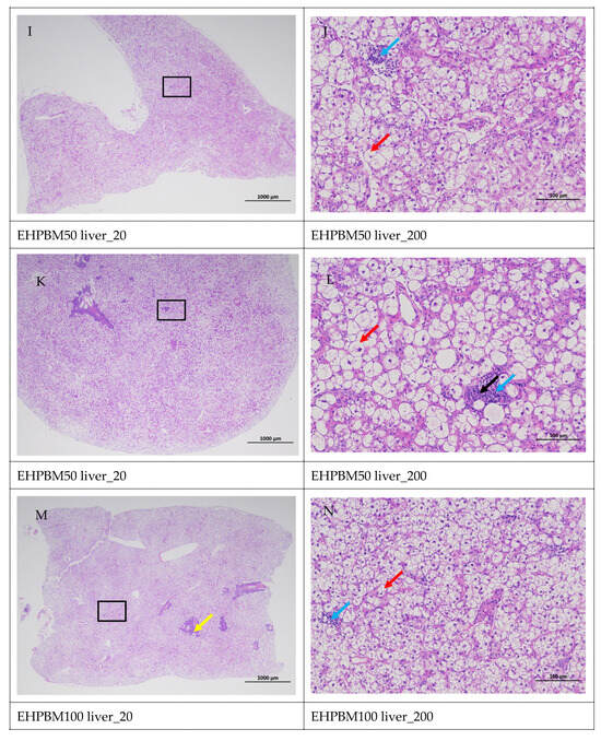 Figure 5 displays hepatic histopathological sections under different magnifications. The area enclosed by the black box on the left corresponds to the magnified region shown on the right. As shown, histopathological analysis of largemouth bass liver sections across four substitution levels demonstrated cytoplasmic vacuolization in hepatocytes from the EHPBM0 and EHPBM20 groups. In contrast, focal inflammatory infiltrates were observed at higher substitution groups (EHPBM50 and EHPBM100), with no evidence of advanced pathological lesions (e.g., necrosis, fibrosis) detected in any treatment group.