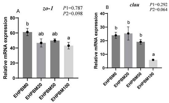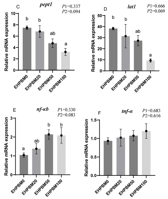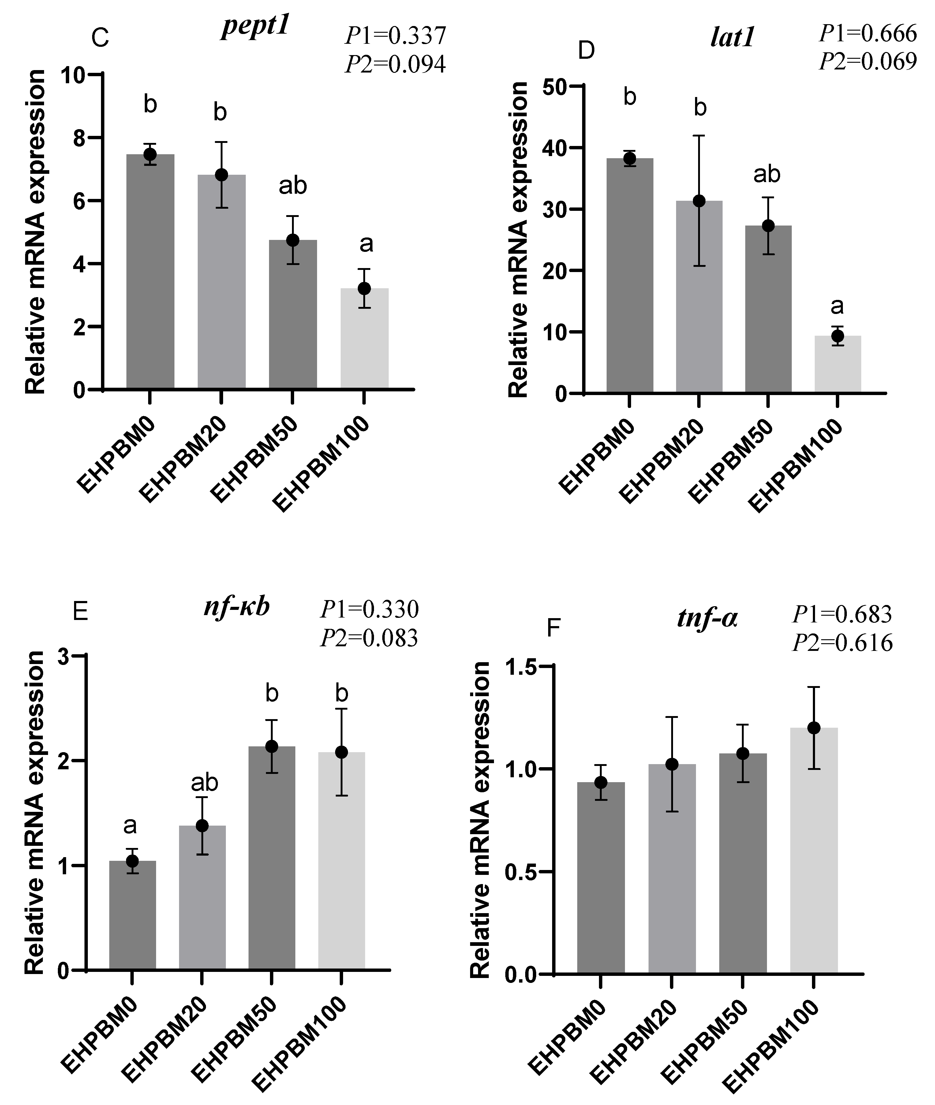 Figure 6 illustrates the expression profiles of intestinal barrier and transport genes under varying EHPBM substitution levels. EHPBM100 group induced significant downregulation of zo-1 and clau expression compared with the EHPBM0 group (p < 0.05). Concurrently, marked suppression was observed in pept1 and lat1 transcript levels compared with the EHPBM0 group (p < 0.05). A significantly increased expression of nf-κb can be observed in group EHPBM50 and EHPBM100 replacement levels in Figure 5E compared with the EHPBM0 group (p < 0.05). In contrast, EHPBM20 and EHPBM50 group substitution regimes exhibited no statistically significant effects on the expression of zo-1, clau, pept1, or lat1 (p > 0.05).