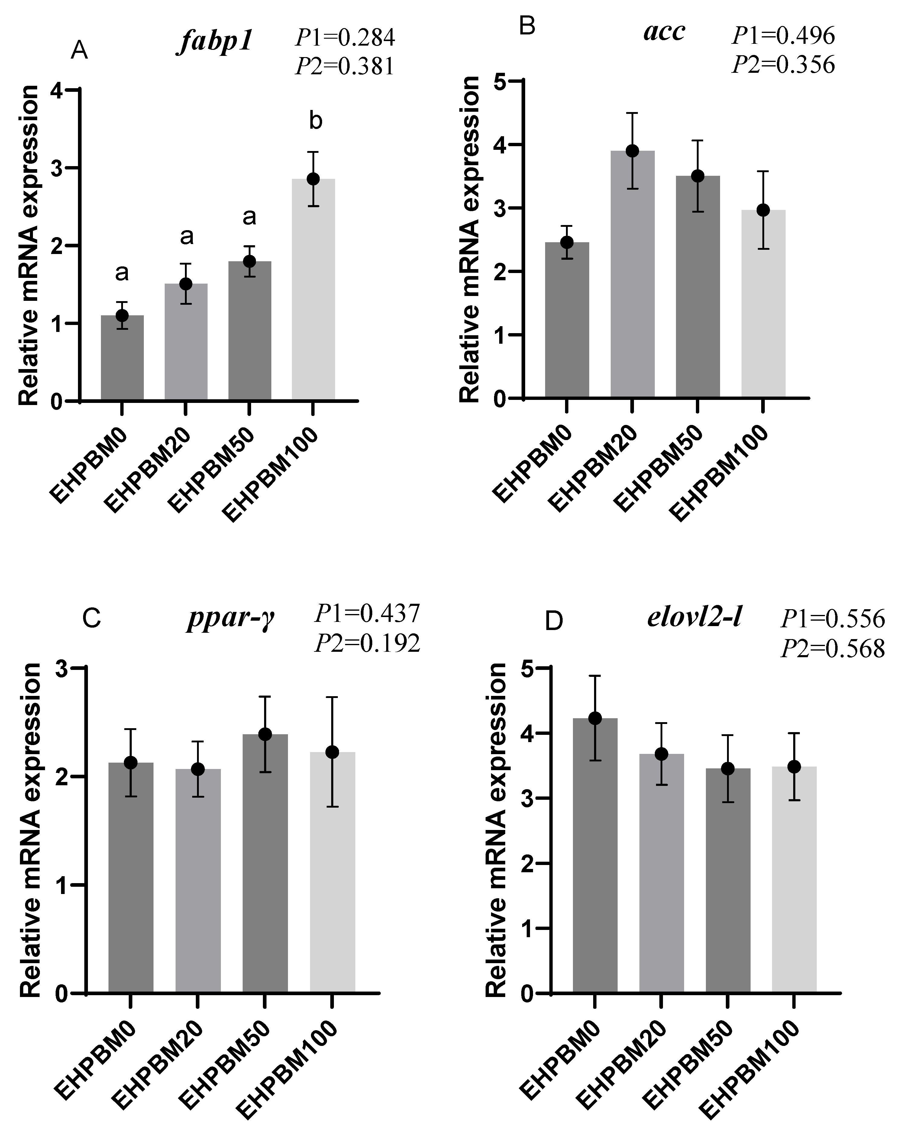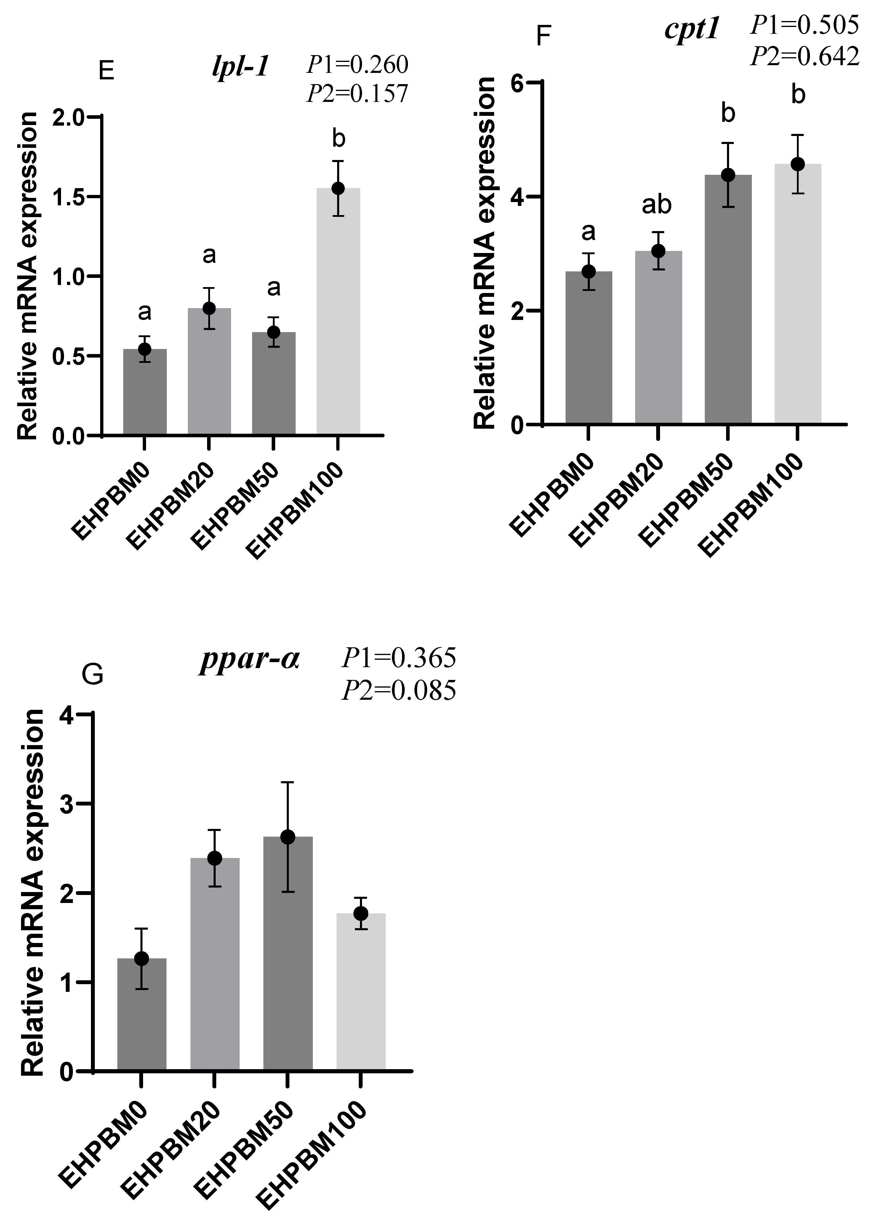 Figure 4 presents the expression profiles of lipid metabolism-related genes under EHPBM substitution regimes. In the EHPBM100 group, significant upregulation was observed in fabp1, lpl-1, and cpt1 expression compared with the EHPBM0 group (p < 0.05). Additionally, cpt1 exhibited marked elevation even in the EHPBM 50 group compared with the EHPBM0 group (p < 0.05). Notably, EHPBM supplementation demonstrated no statistically significant correlations with the expression levels of acc, ppar-γ, elovl2, or ppar-α compared to controls (p > 0.05).