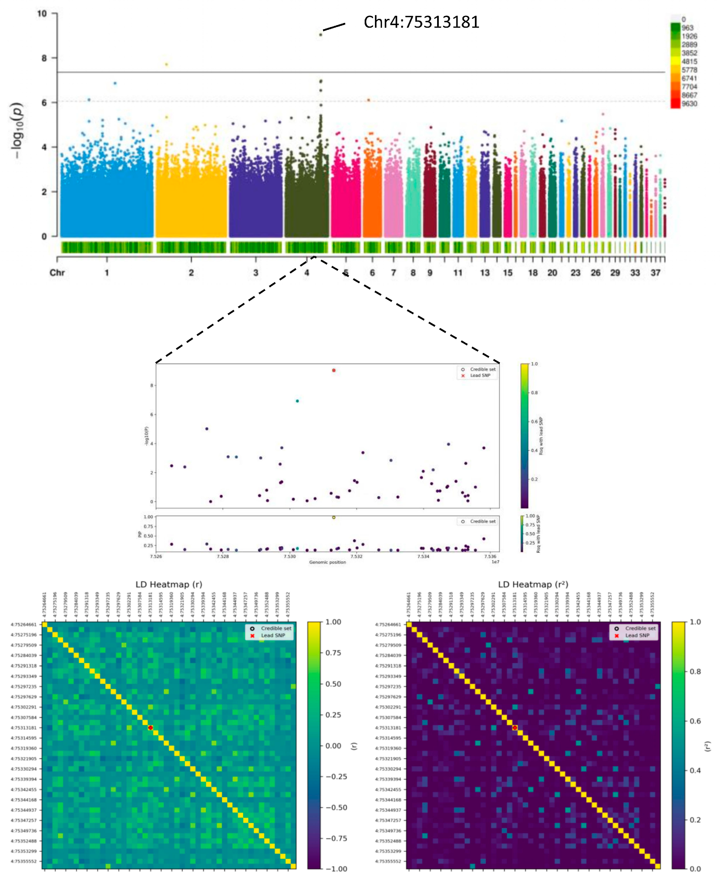 | 4:75313181 | T/A | 0.356 | 0.30 ± 0.05 | 9.18 × 10−10 | 4.12 | |