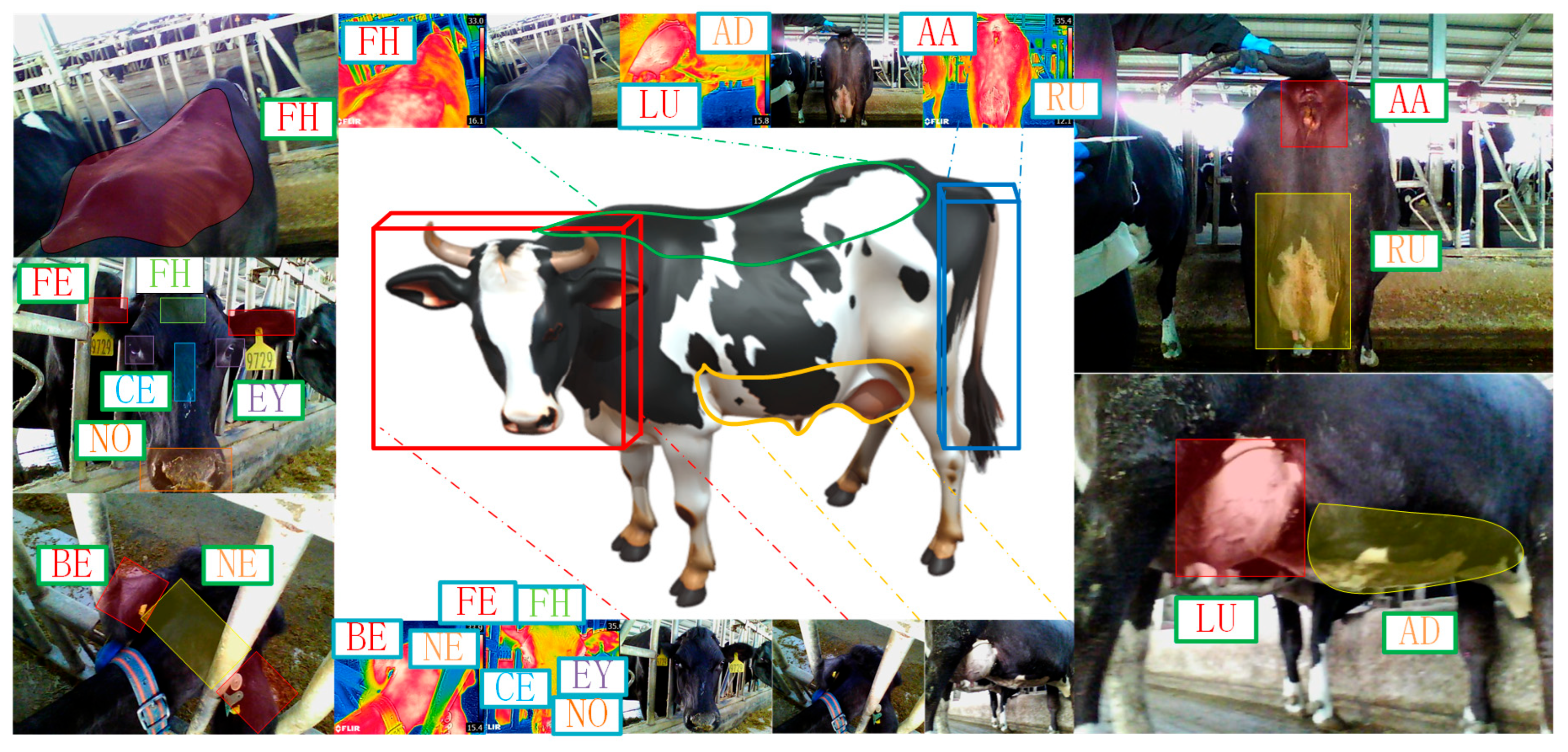 - Wang, Y.; Kang, X.; Chu, M.; Liu, G. Deep Learning-based Automatic Dairy Cow ocular Surface Temperature Detection From Thermal Images. Comput. Electron. Agric. 2022, 202, 107429. [Google Scholar] [CrossRef]