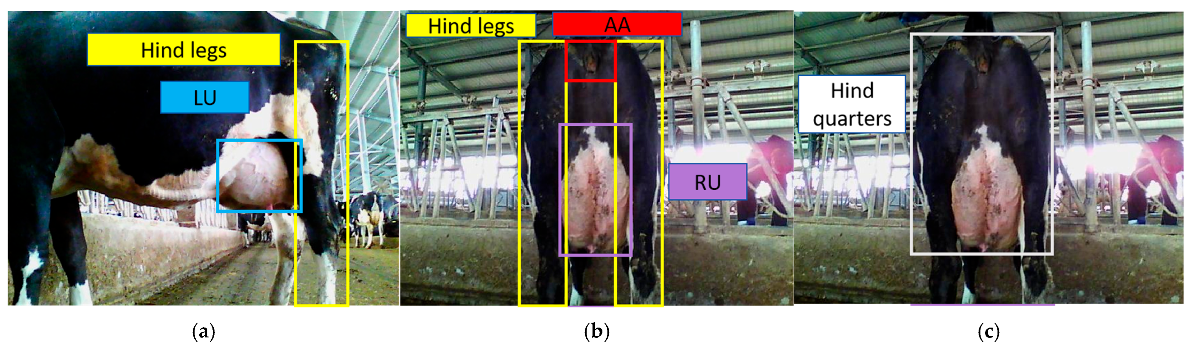 - Fur colour pattern: In Holstein cows, the udder is predominantly white but may contain small black patches and is connected to surrounding irregular black–white fur patterns. Even these occasional dark areas can noticeably degrade model performance, as the network can only learn from shape cues and two fur colours. This study mainly addresses the effect of small black patches and black–white junctions around the udder; future research will further refine the model for cows with predominantly white udders.