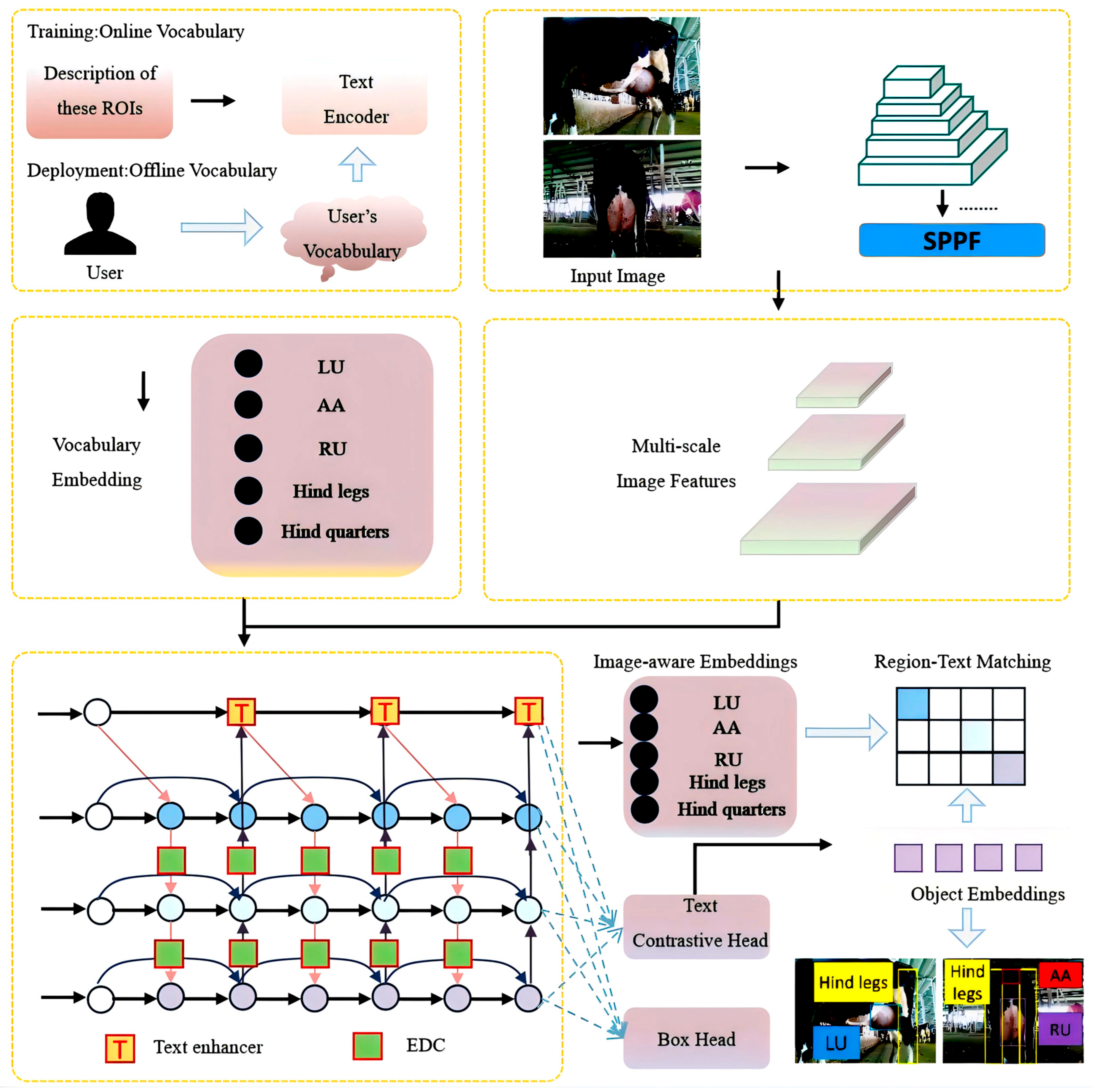 APA StyleSong, H., Kang, Z., Xue, H., Hu, J., & Norton, T. (2025). EDC-YOLO-World-DB: A Model for Dairy Cow ROI Detection and Temperature Extraction Under Complex Conditions. Animals, 15(23), 3361. https://doi.org/10.3390/ani15233361