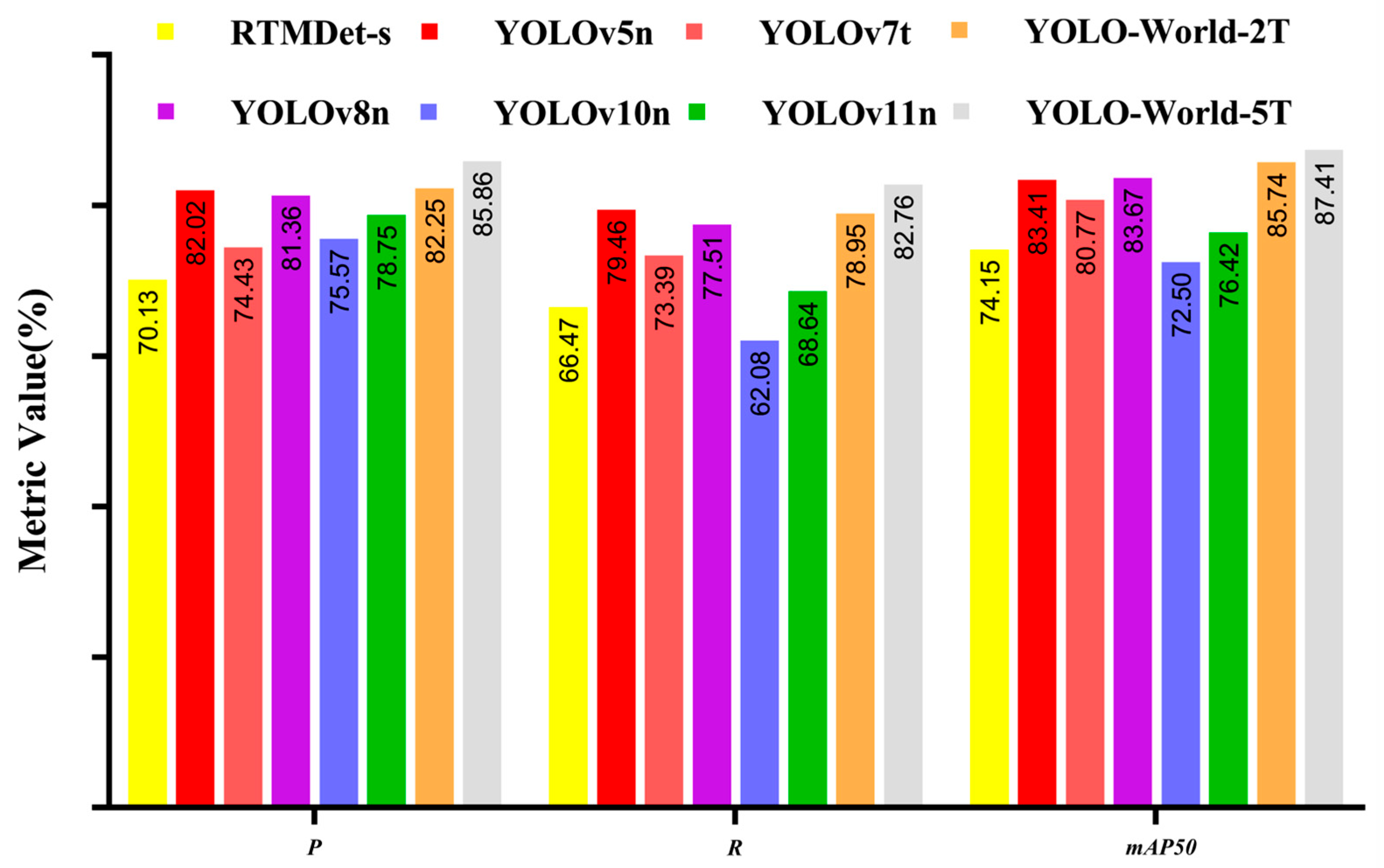 - The improved training strategy significantly enhances positive sample quality and localisation stability. This optimisation enables the final model to achieve P = 88.65%, R = 85.77%, and mAP50 = 89.33%, representing improvements of 2.79%, 3.01%, and 1.92%, respectively, over the unmodified version.