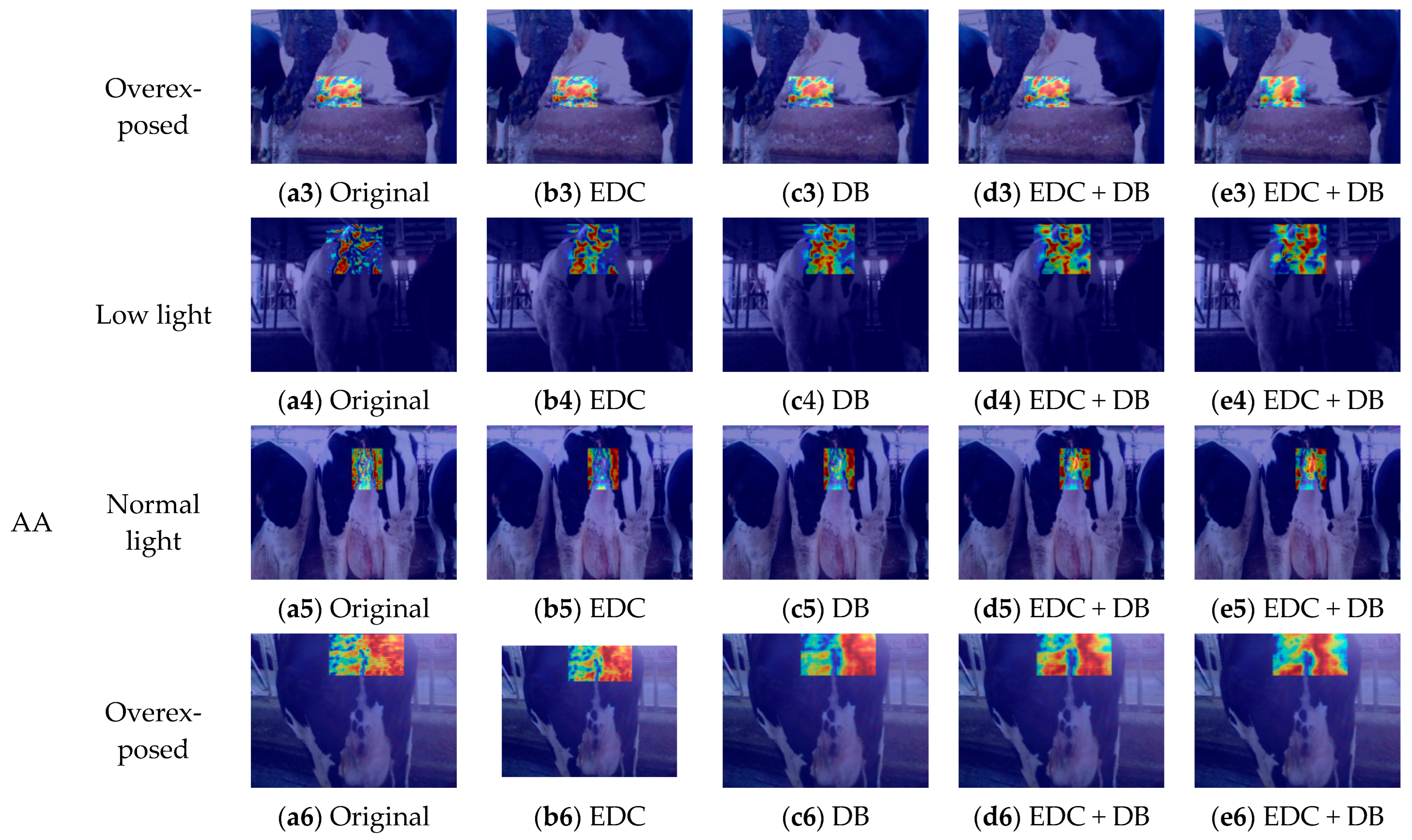 Chicago/Turabian StyleSong, Hang, Zhongwei Kang, Hang Xue, Jun Hu, and Tomas Norton. 2025. "EDC-YOLO-World-DB: A Model for Dairy Cow ROI Detection and Temperature Extraction Under Complex Conditions" Animals 15, no. 23: 3361. https://doi.org/10.3390/ani15233361