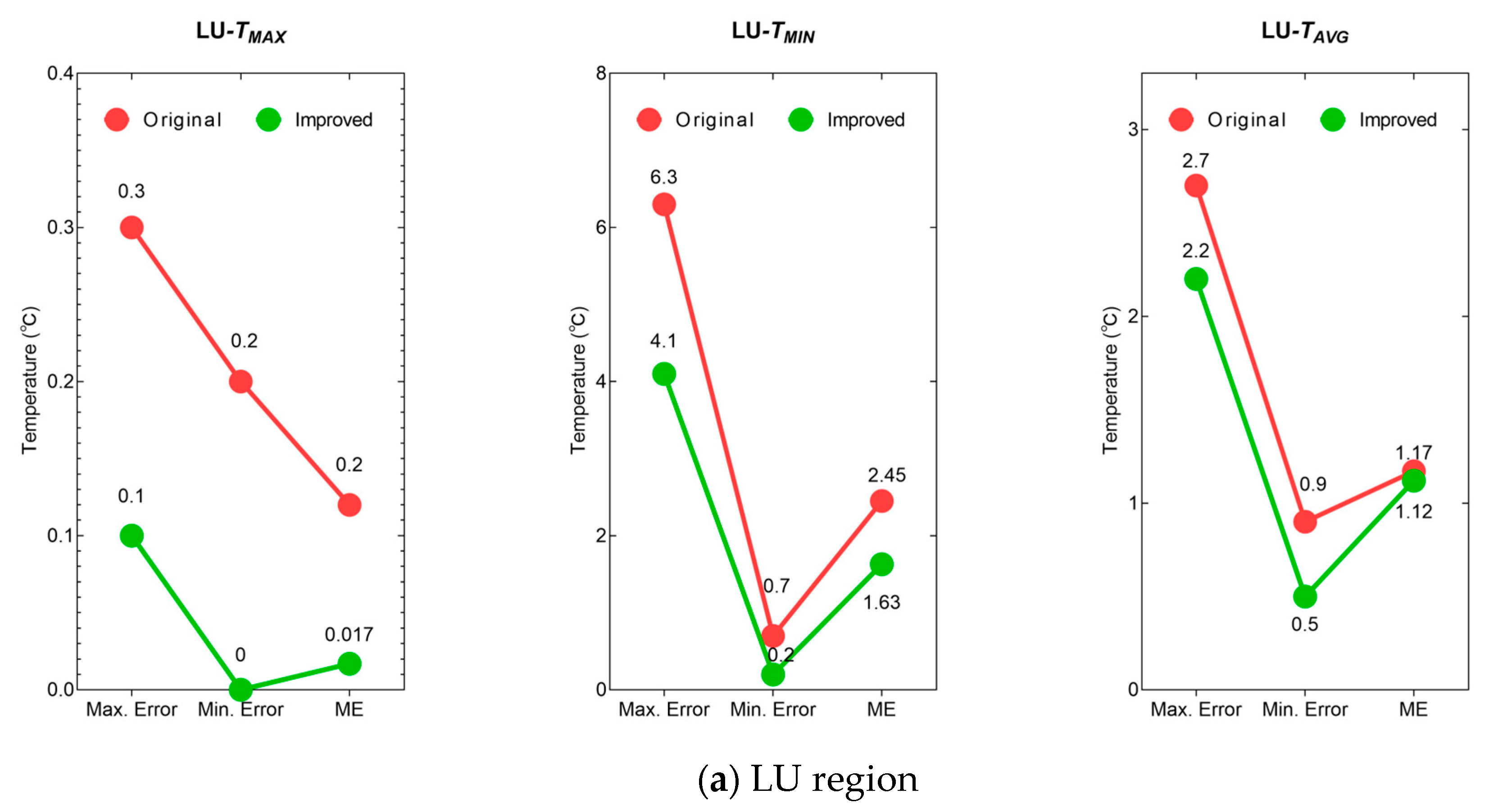 - With the proposed method, the errors in extracting , , and were significantly reduced. Specifically, for LU, the ME of , , and decreased by 66.6%, 33.5%, and 4.27%, respectively, compared to the original values; for AA, the ME of , , and decreased by 66.6%, 25.4%, and 11.3%, respectively.