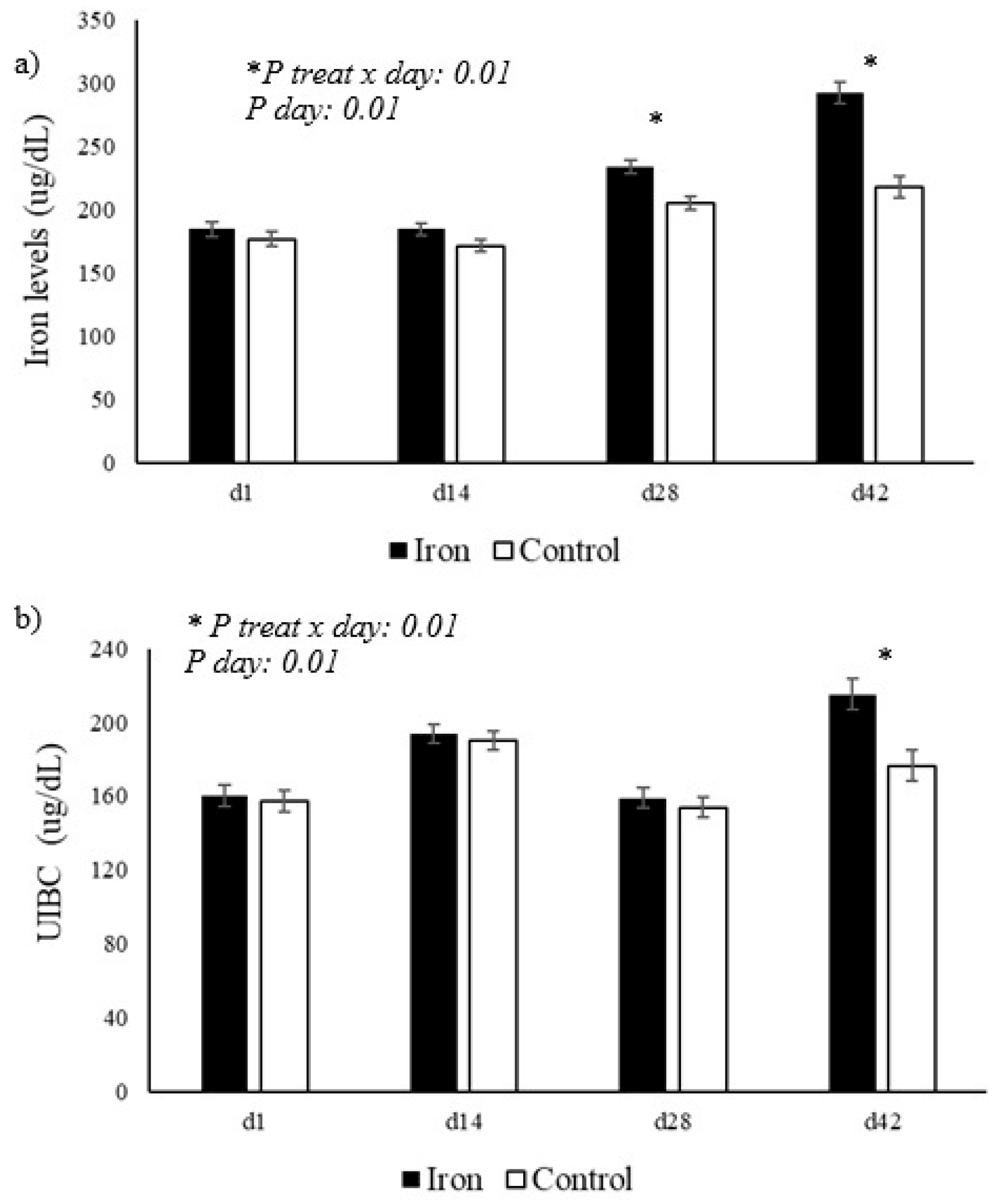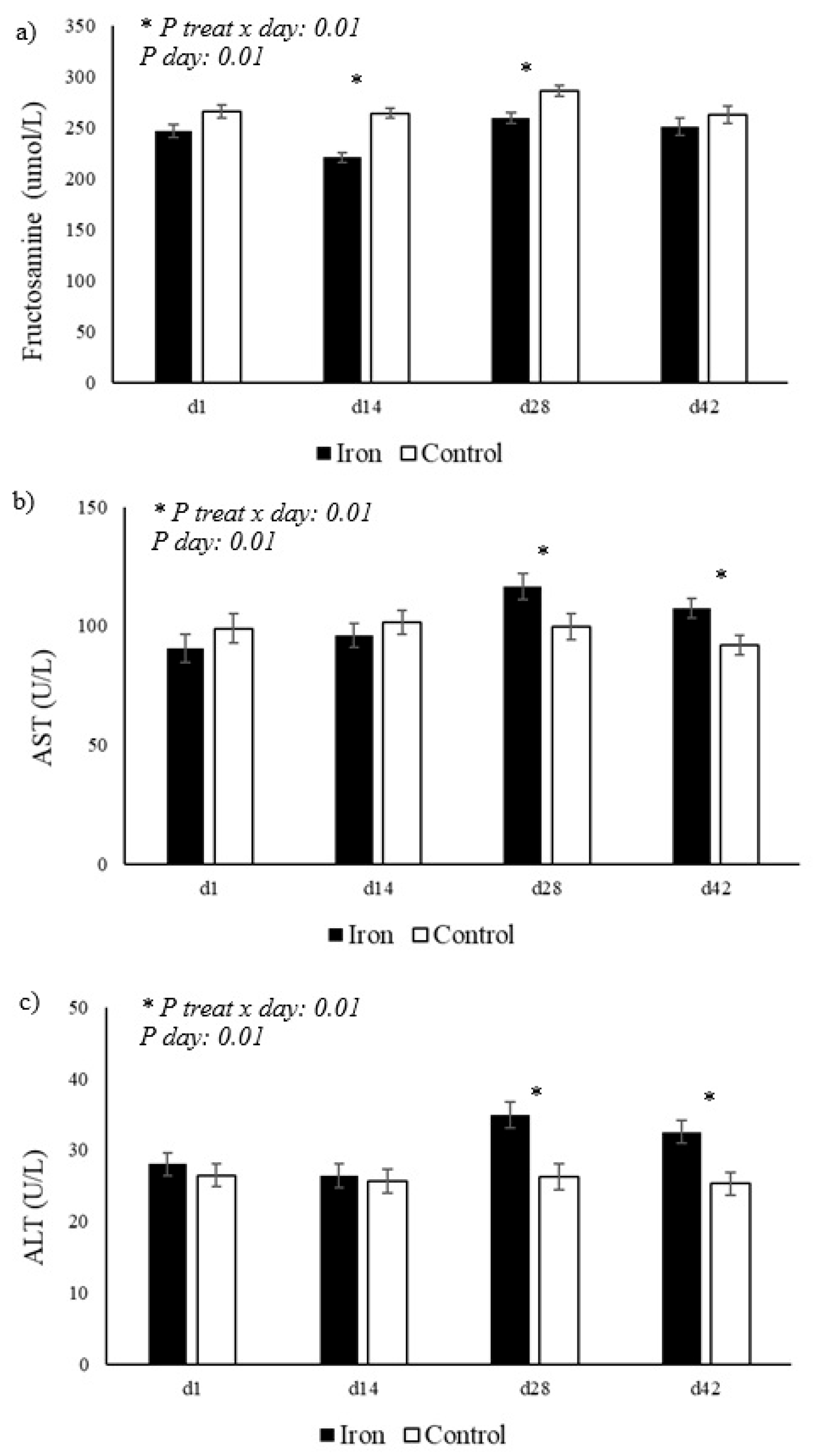 Note: Different letters within the same row indicate statistical differences between groups (p ≤ 0.05) or trends (0.05 < p ≤ 0.10). GGT = gamma-glutamyl transferase; UIBC = unsaturated iron-binding capacity; AST = aspartate aminotransferase; ALT = alanine aminotransferase. Treat = treatment.