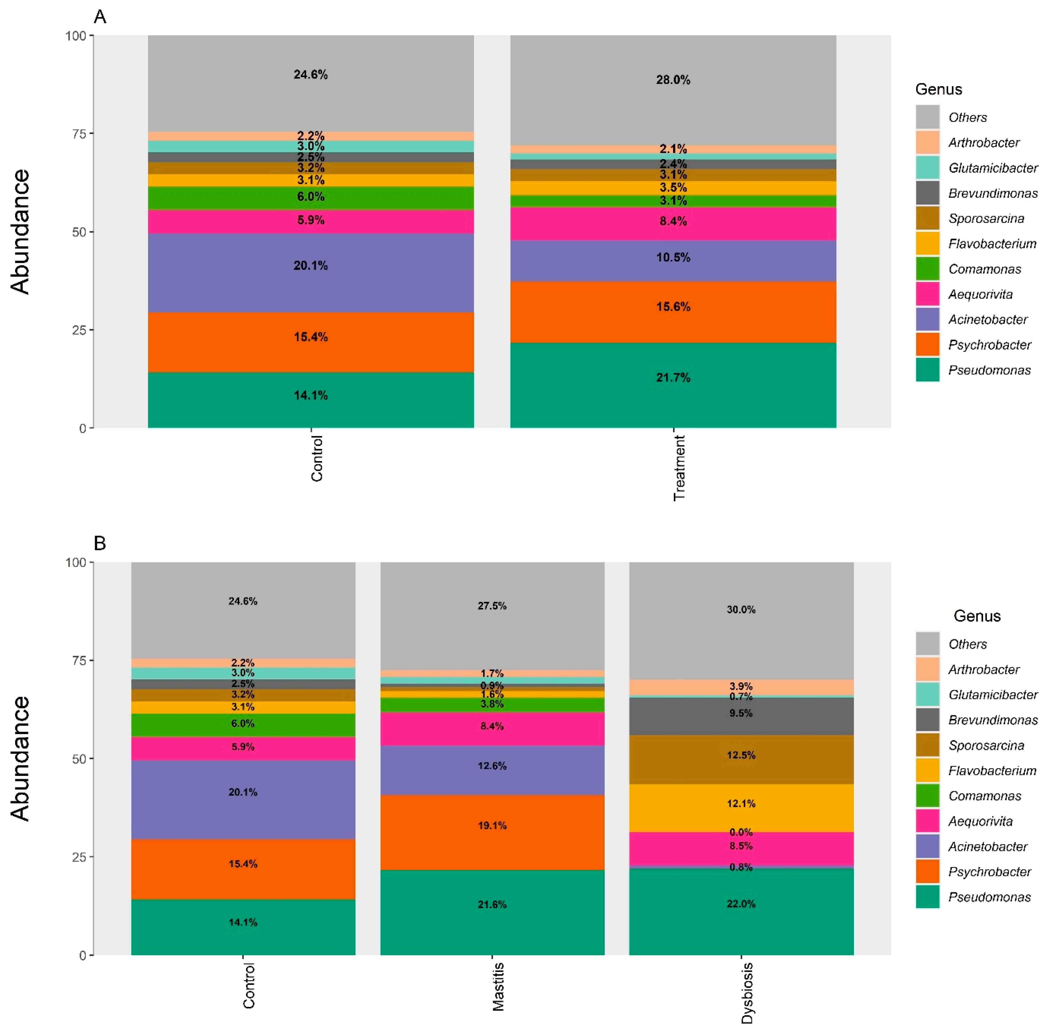 Raw sequencing data were analyzed using Mothur v.1.48.3 [22], following the established MiSeq Standard Operating Procedure [23]. Taxonomic classification of representative oligotype sequences was performed against the SILVA reference database (release 132) [24] and Greengenes2 database [25]. The resulting clustered operational taxonomic unit (OTU) data was subsequently imported into R version 4.5.1 (R Core Team, 2025) for downstream processing with the Phyloseq package (v1.52) [26]. Microeco package (v1.15.0) was applied to aggregate taxonomic abundance data at the genus and species level, and relative abundance profiles of the ten most prevalent genera and species were generated by averaging across animals and experimental groups [27]. ggplot2 package (v4.0.0) was used to build graphical plots [28].