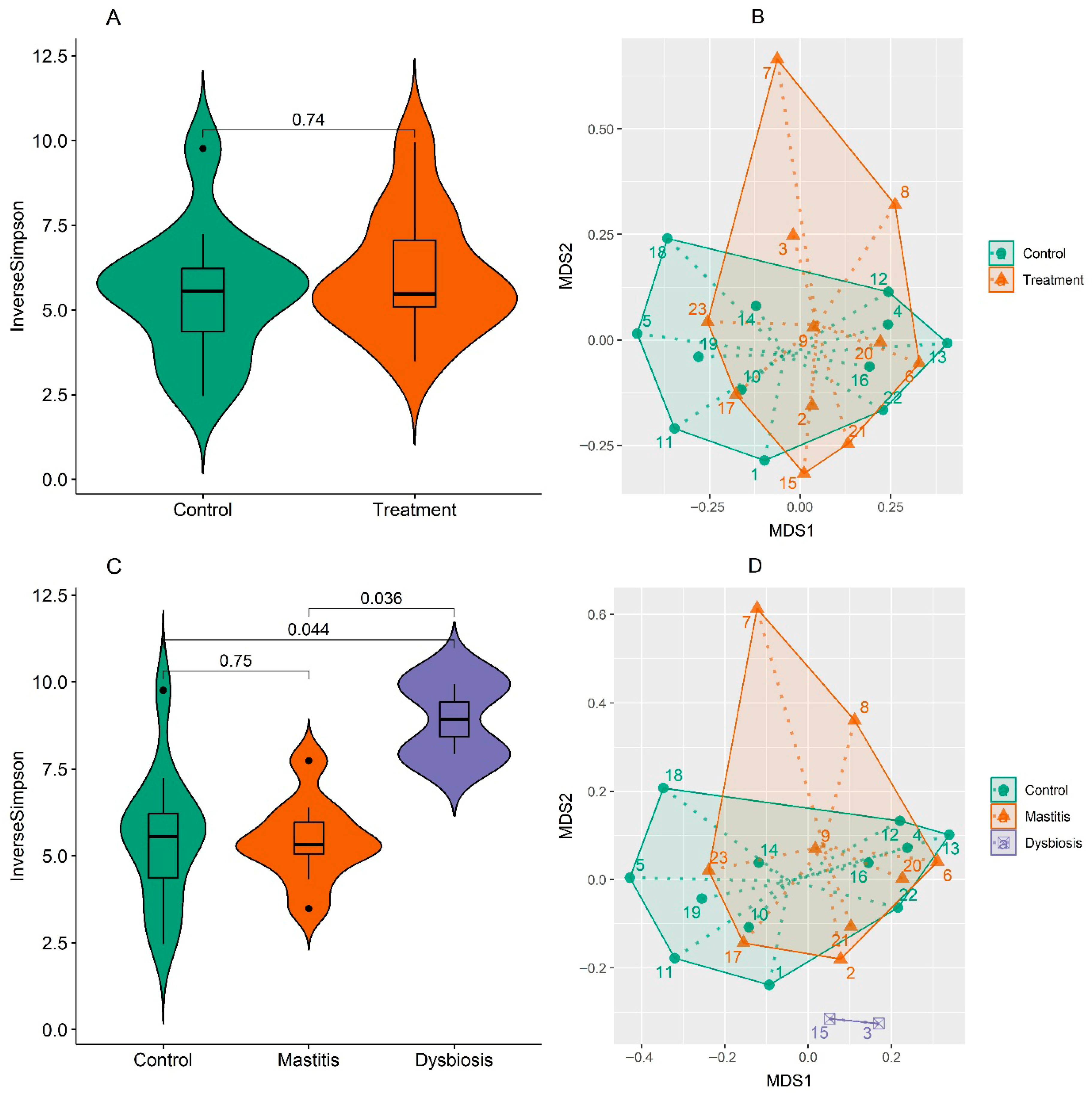 Alpha diversity within bacterial communities was assessed using violin plots of the inverse Simpson diversity index. Differences in microbial community composition among samples were examined using Principal Coordinate Analysis (PCoA) constructed from Bray–Curtis dissimilarity matrices. This ordination approach enables visualization of beta diversity patterns, highlighting compositional dissimilarities between groups based on overall taxonomic profiles.