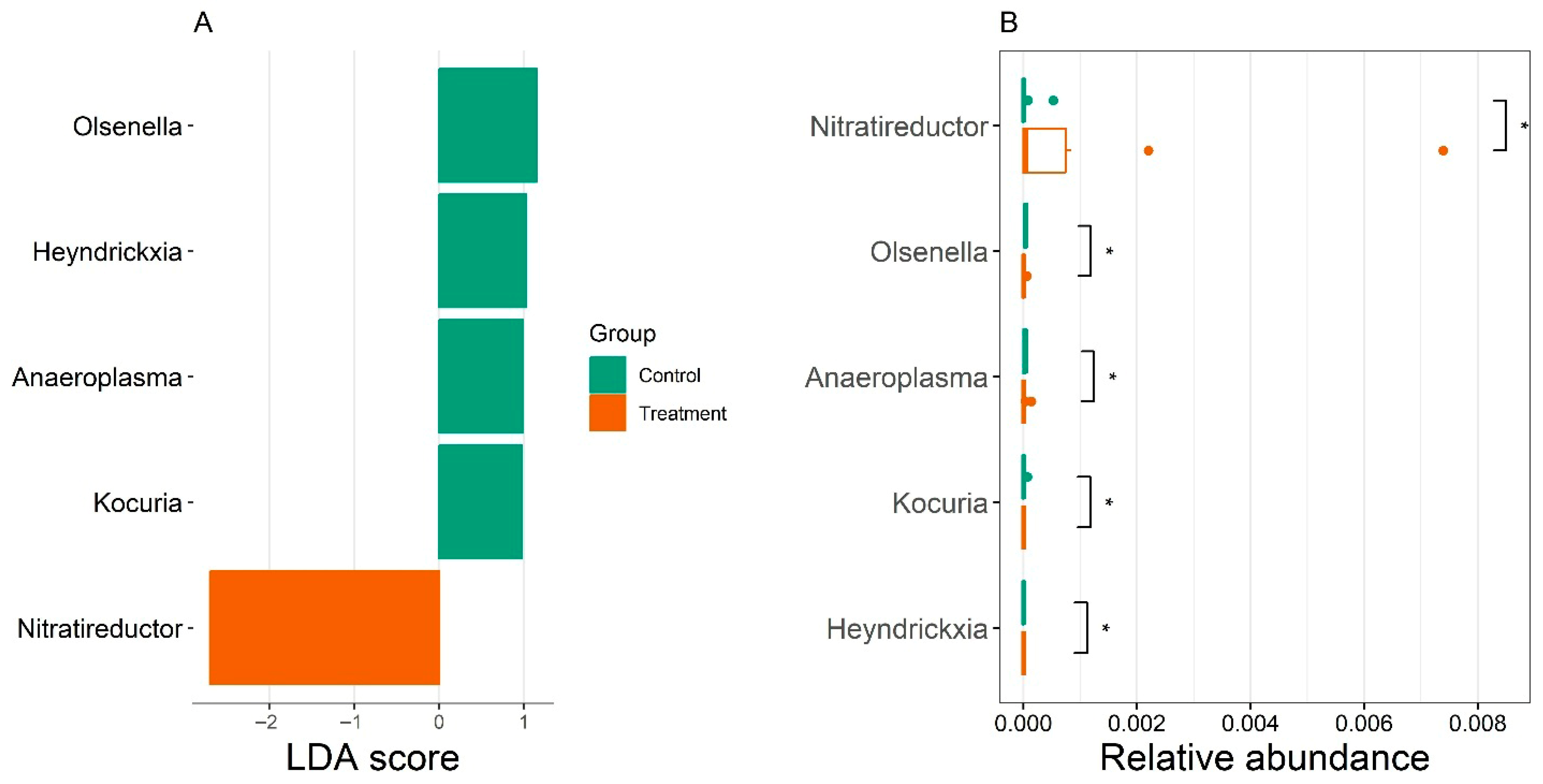 To identify bacterial taxa that differed significantly in relative abundance among experimental groups, differential taxonomic analysis was performed using the LEfSe (Linear Discriminant Analysis Effect Size) algorithm [29]. This approach combines non-parametric statistical testing with linear discriminant analysis to detect features that best explain group-level differences, thereby revealing discriminative microbial taxa and patterns of community structure across treatments.
