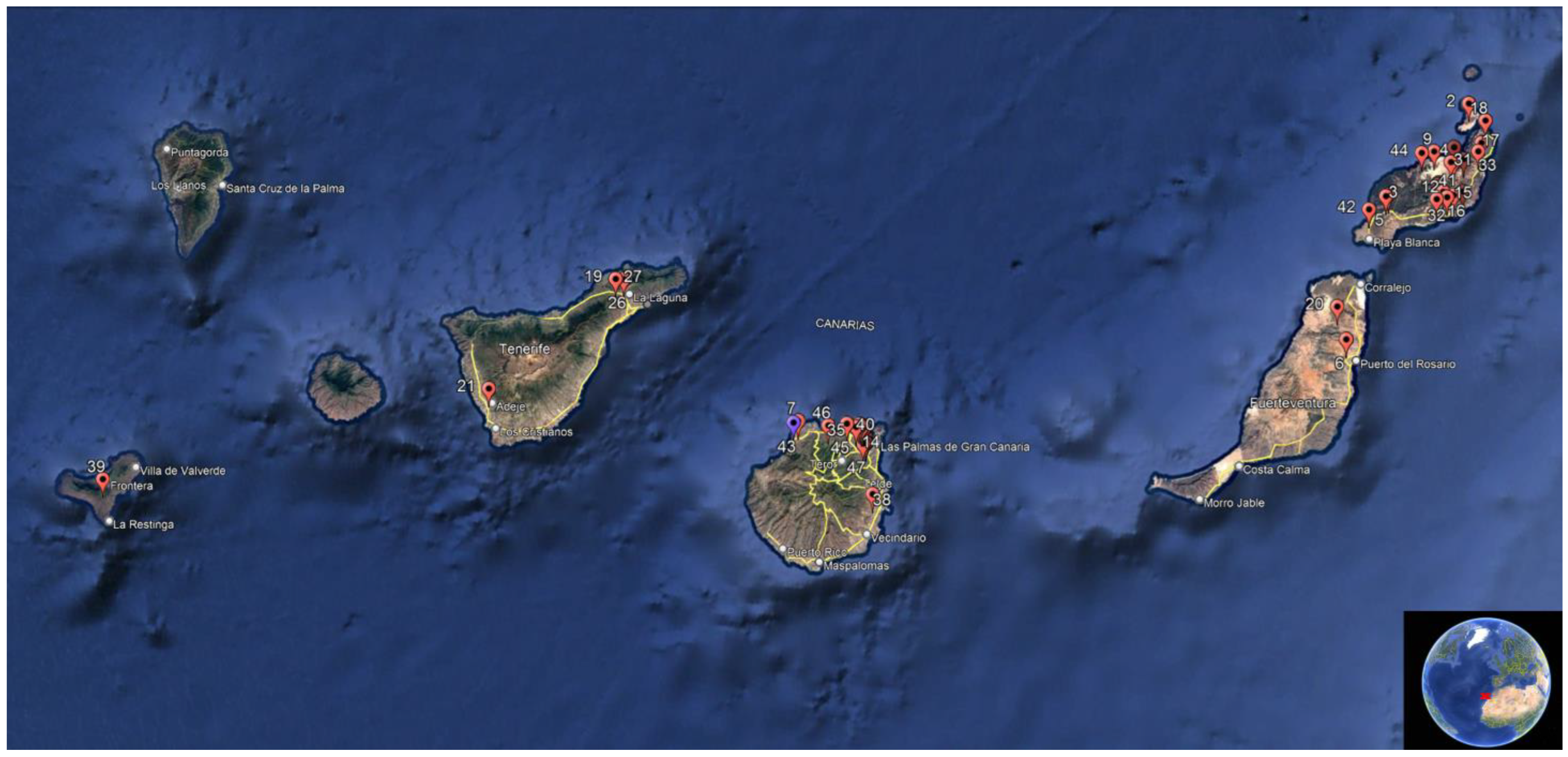 - Lorenzo, J.A. Atlas de las Aves Nidificantes en el Archipiélago Canario (1997–2003); Dirección General de Conservación de la Naturaleza & Sociedad Española de Ornitología: Madrid, Spain, 2007. [Google Scholar]