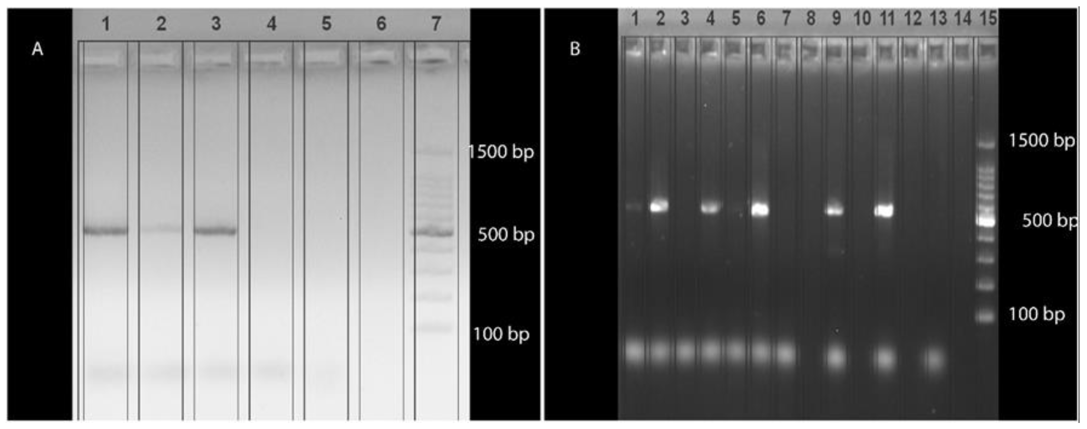 2.4. Detection and Sequencing of PCR Products and Phylogenetic Analysis