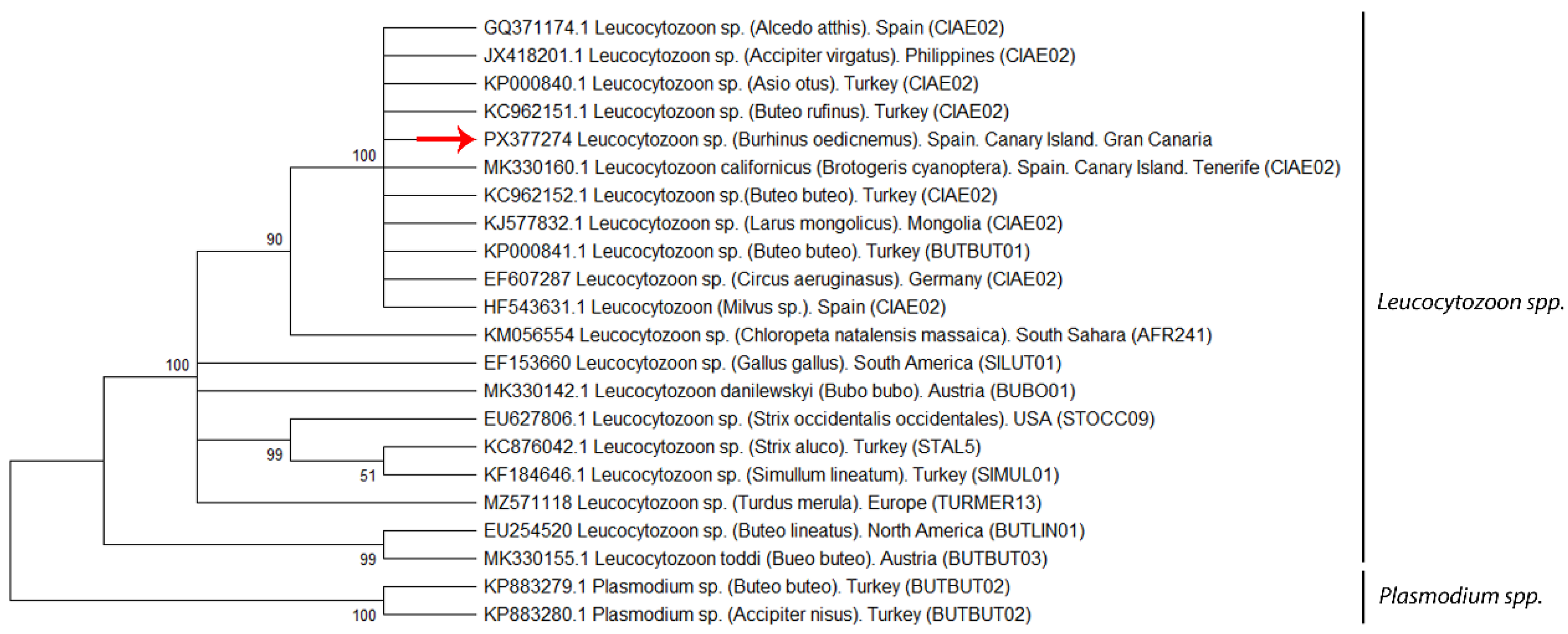 Colom-Rivero, A.; Fernández, A.; Marrero-Ponce, L.; Grandía-Guzmán, R.; Caballero-Hernández, L.; Rivero-Herrera, C.; Suárez-Santana, C.M.; Sierra, E. Survey of Haemosporidian Parasites in Wild Stone-Curlews (Burhinus oedicnemus) in the Canary Islands: First Molecular and Histopathological Evidence of Leucocytozoon sp. Infection. Animals 2025, 15, 3381. https://doi.org/10.3390/ani15233381