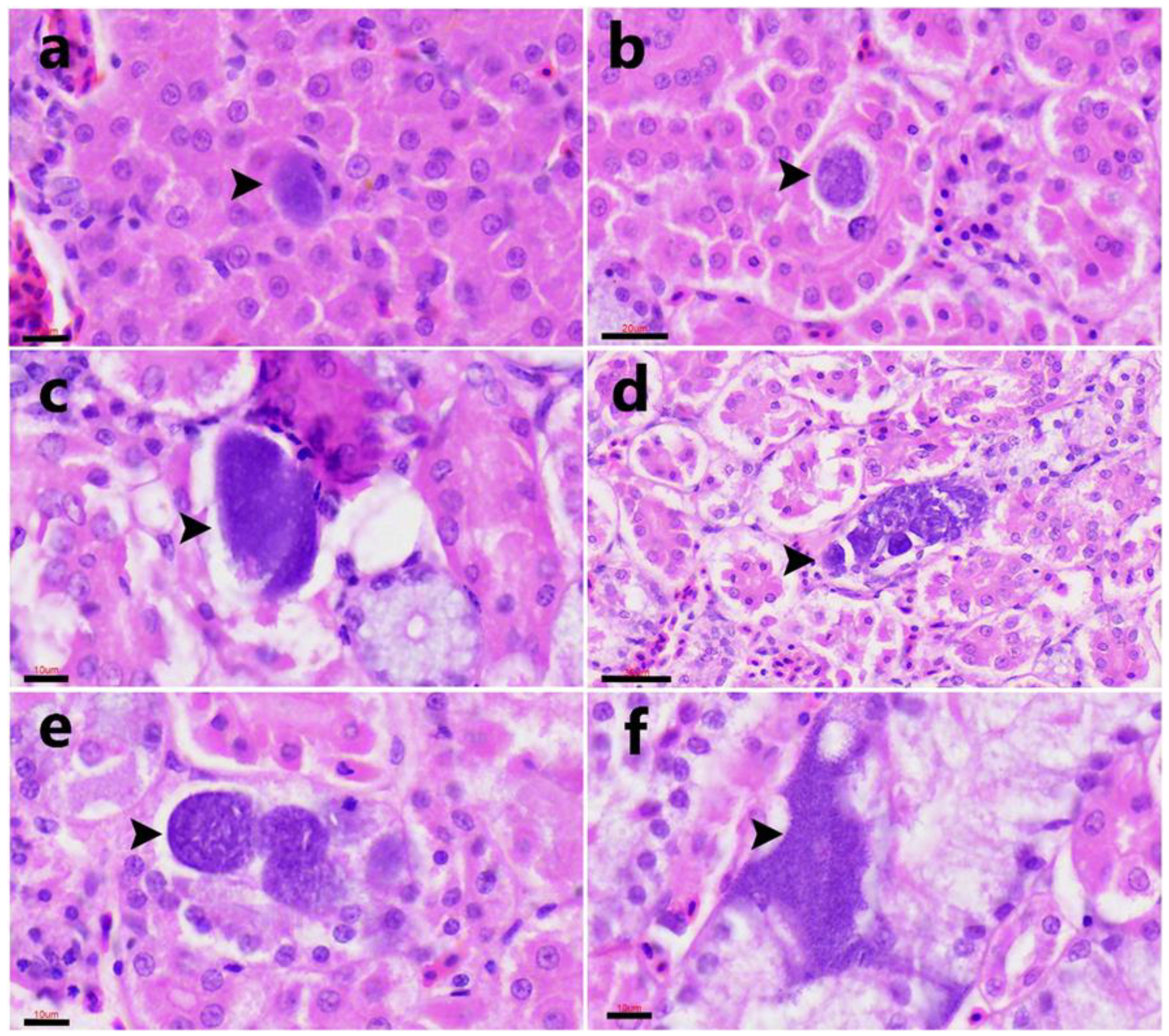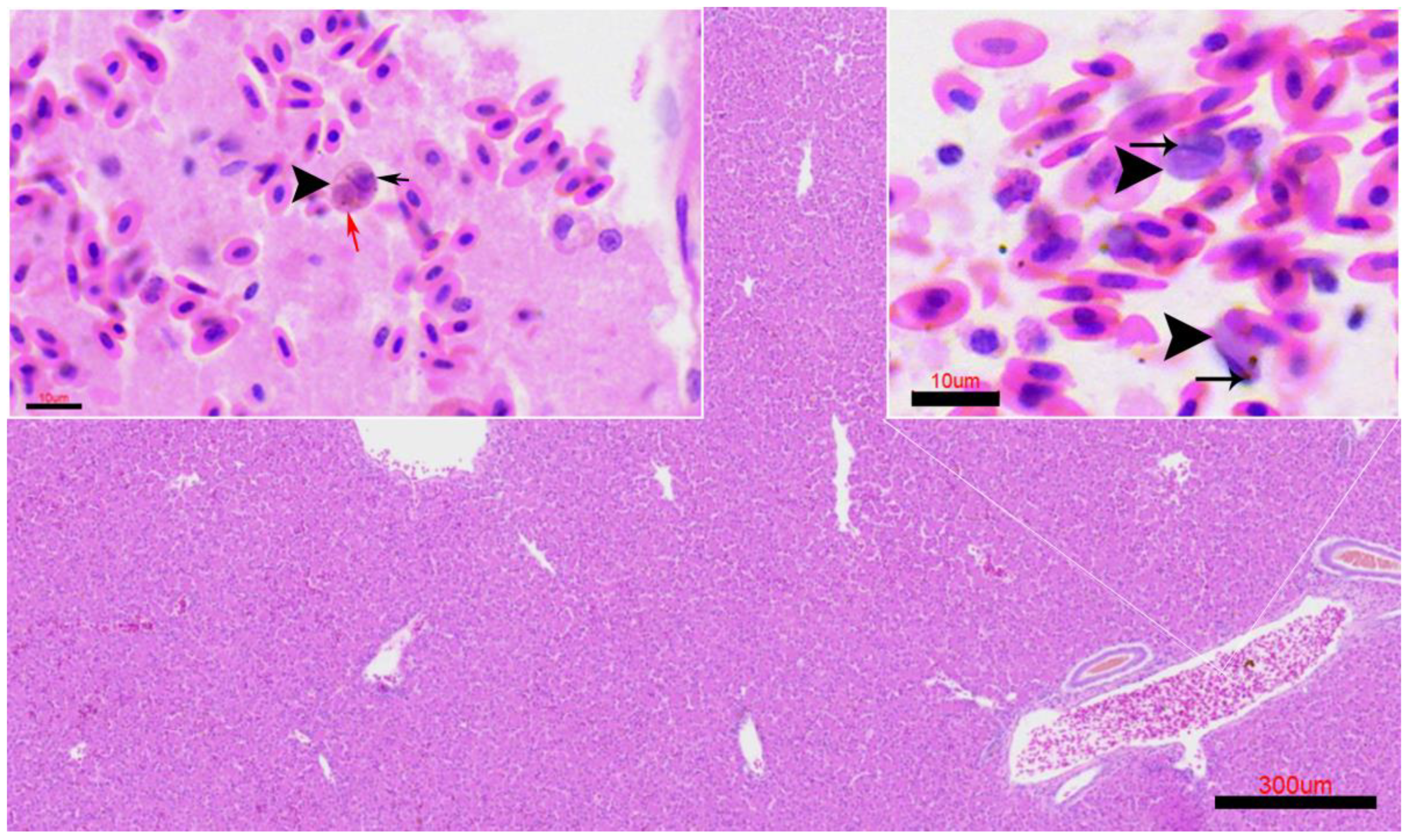 - Tchoumbou, M.; Iezhova, T.; Hernández-Lara, C.; Duc, M.; Valkiūnas, G. Unravelling the patterns of exo-erythrocytic development of Haemoproteus parasites (Haemoproteidae, Haemosporida), with a case of abortive tissue stages in a naturally infected bird. Int. J. Parasitol. 2025, 55, 15–26. [Google Scholar] [CrossRef]