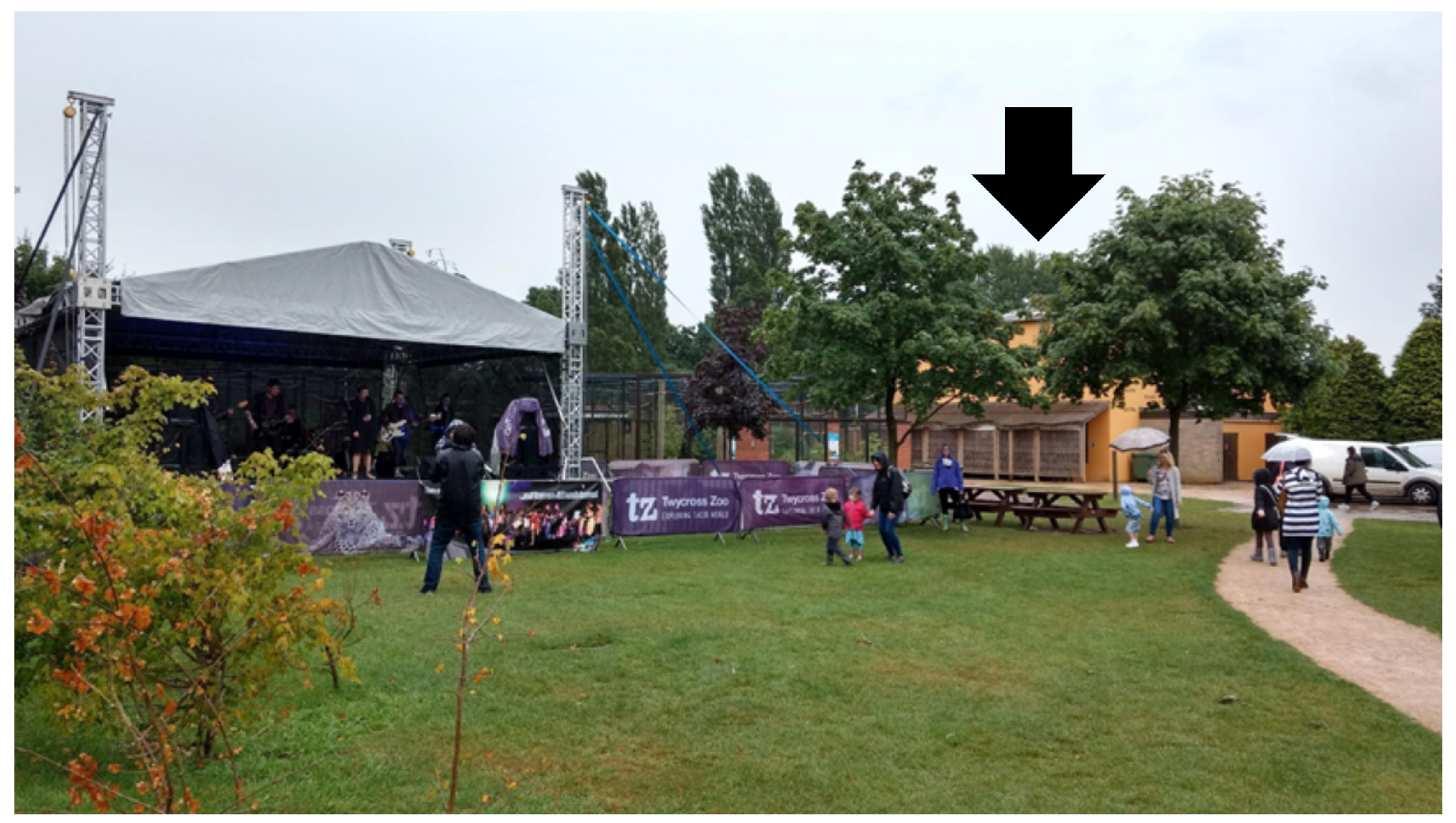 Figure 1. Summer event in Twycross Zoo, UK. Stage concert located next to the orangutans’ enclosure (light-orange building indicated by a black arrow).