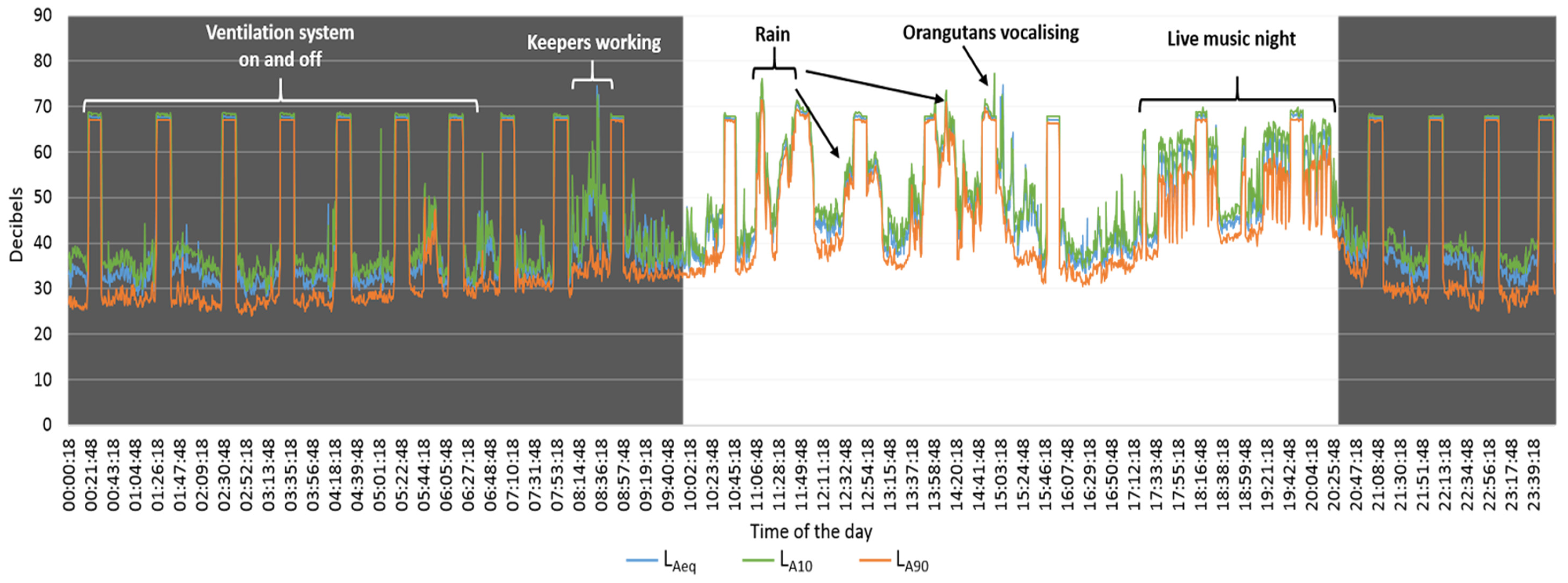 Figure 2. Borneo orangutans’ enclosure sound pressure levels during a summer event day in Twycross Zoo, UK. Continuous 24 h recordings are presented to illustrate the overall daily soundscape. Hours when the zoo was open (white background, 10:00–20:30) indicate the period used for statistical analyses; hours when the zoo was closed are shaded in grey.