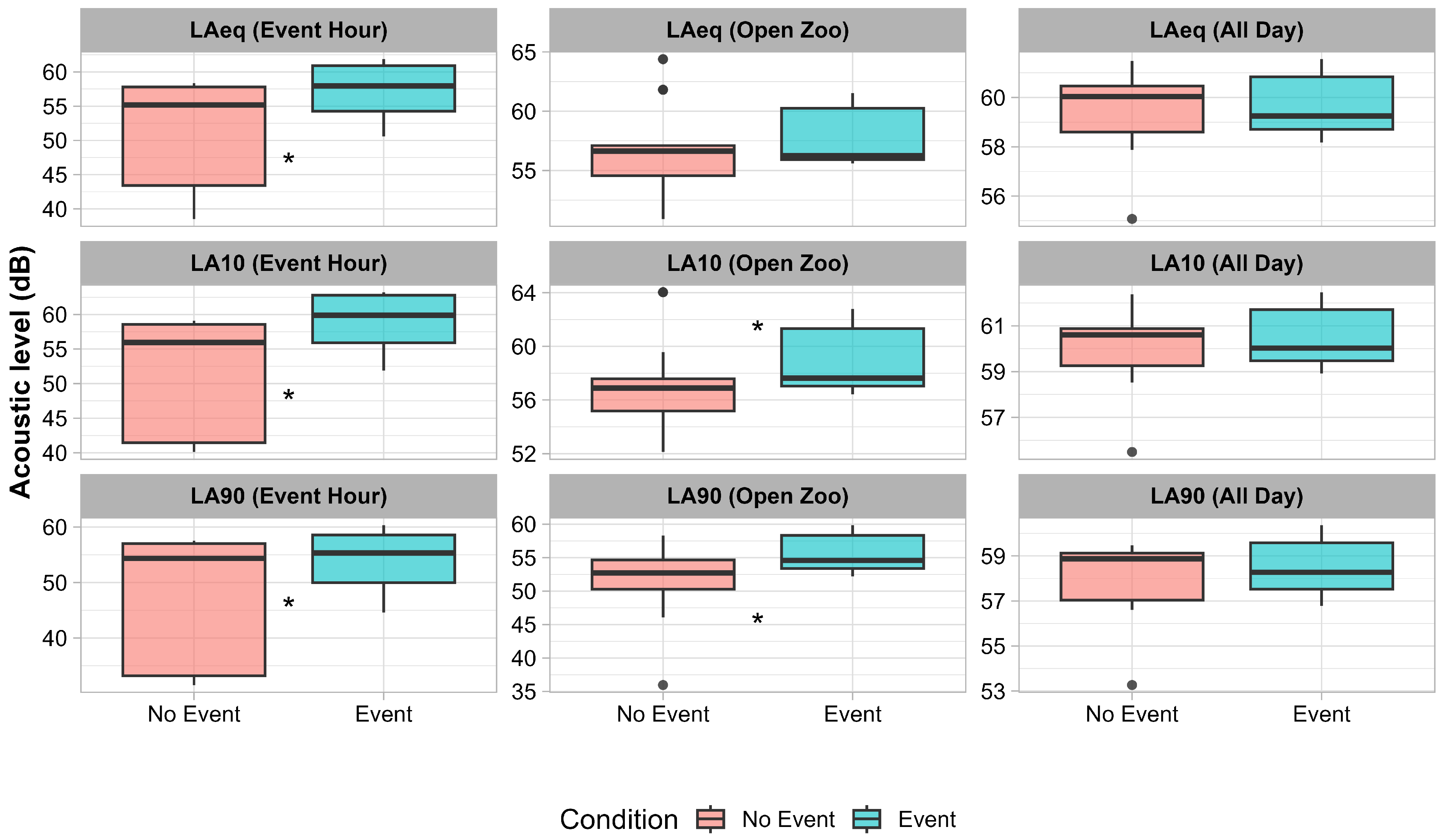 Figure 3. Equivalent sound levels (Laeq) recorded at the Borneo orangutan enclosure in Twycross Zoo (UK). Boxplots show the distribution of acoustic metrics on non-event (No Event; red) and event (Event; blue) days for LAeq, LA10, and LA90. In each plot, the central line represents the median, the box corresponds to the interquartile range (IQR), the whiskers extend to 1.5 × IQR, and points beyond the whiskers indicate statistical outliers. Asterisks between boxplots indicate statistically significant differences between conditions (Wilcoxon test, adjusted p < 0.05).