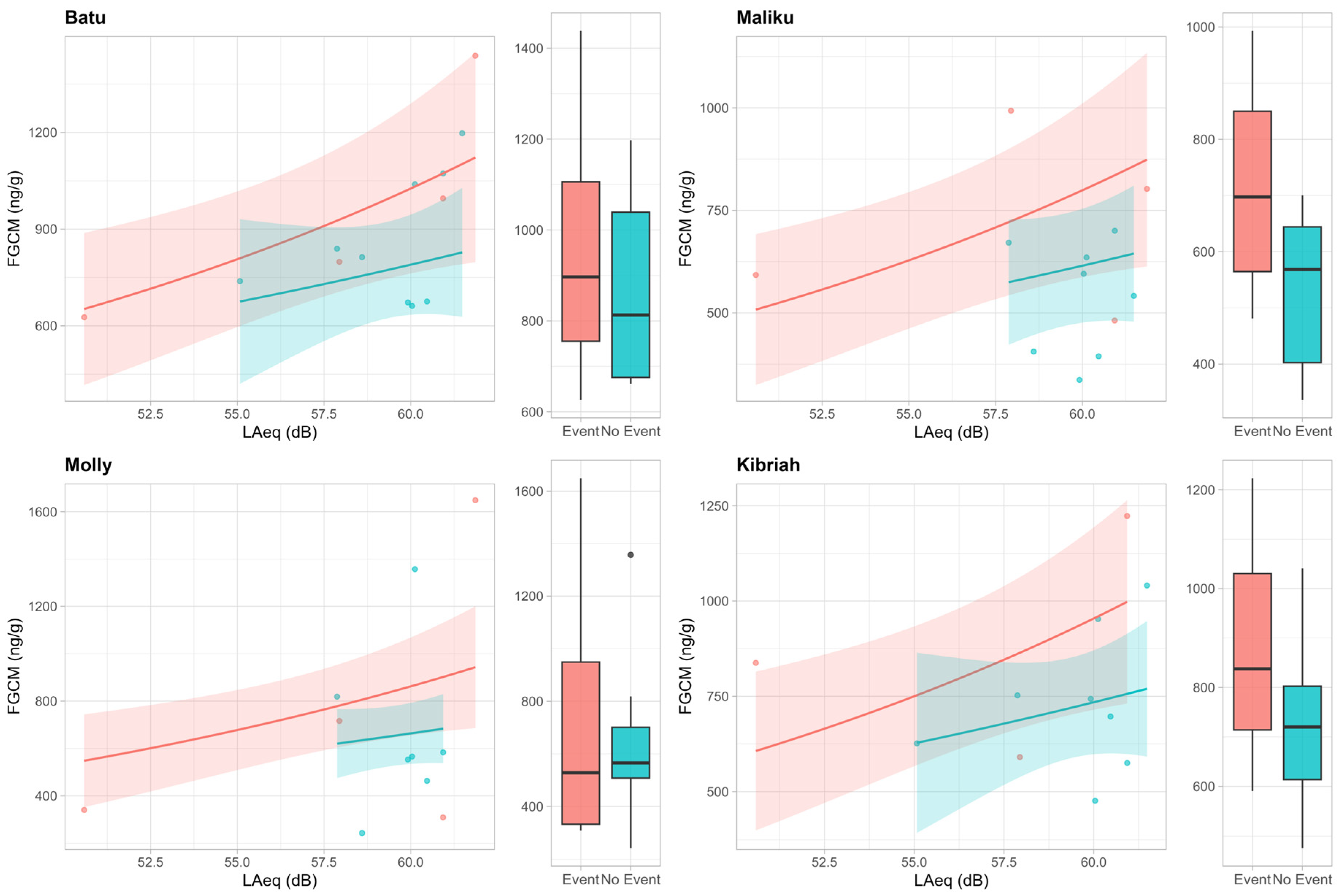 Group-averaged FGCM concentrations were higher on event days compared to non-event days (mean ± SE: Event = 826 ± 99 ng/g, No Event = 701 ± 44 ng/g). However, comparisons of FGCM levels between Event and No Event days for each individual showed no significant differences (Batu: t = 0.58, p = 0.596; Maliku: t = 1.48, p = 0.212; Molly: t = 0.29, p = 0.786; Kibriah: t = 0.77, p = 0.506). These results are consistent with the GLMM analysis (Table 1), which showed no significant effect of Event on FGCM levels. In contrast, FGCM concentrations increased significantly with increasing acoustic levels (LAeq) across all individuals (Table 1), and the interaction between LAeq and Condition was non-significant, indicating that the positive relationship between acoustic exposure and adrenocortical activity was consistent across both Event and No Event days.