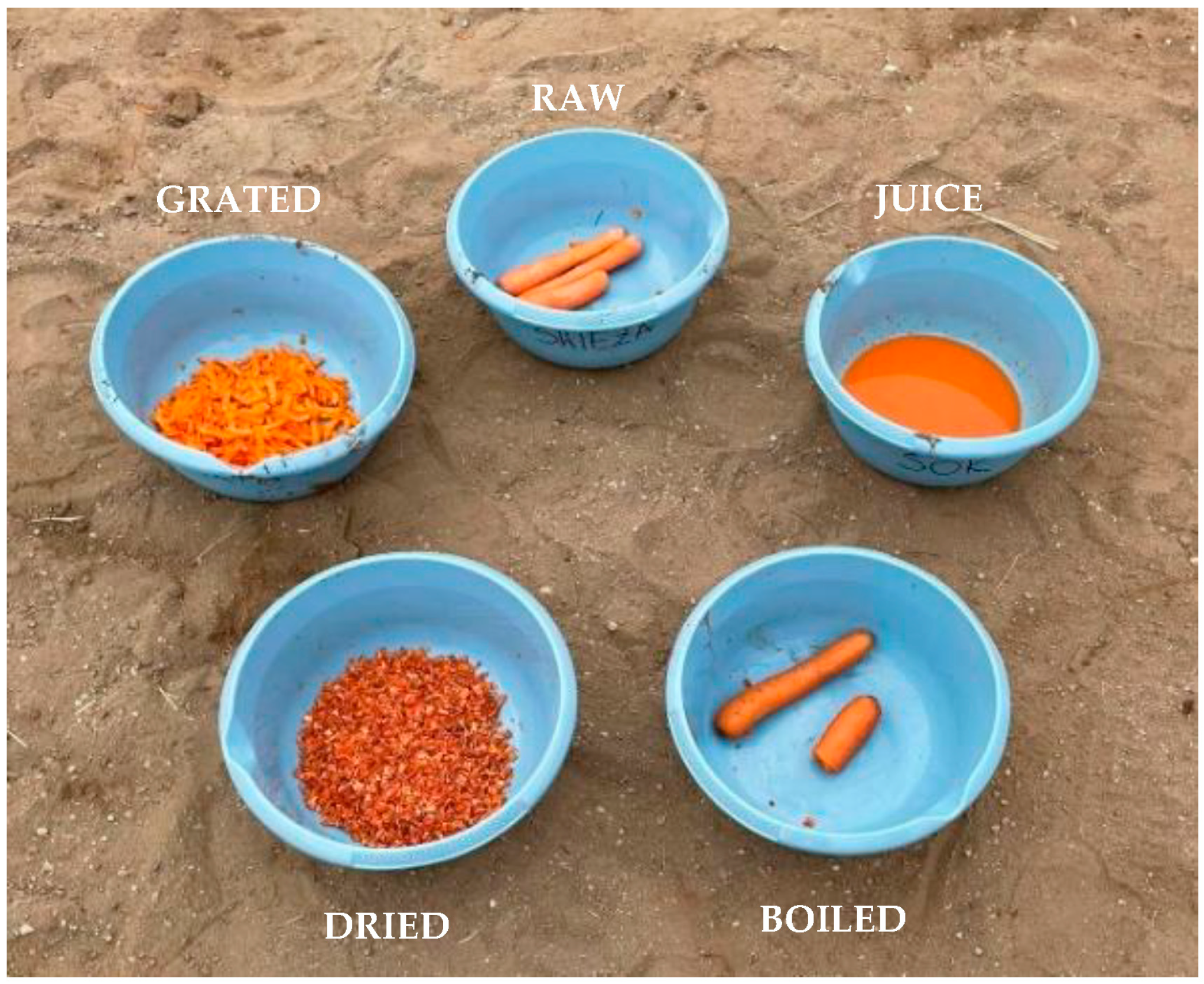 - United States Department of Agriculture (USDA). FoodData Central: Carrots, Dehydrated (FDC ID 170500); U.S. Department of Agriculture, Agricultural Research Service: Washington, DC, USA, 2019. Available online: https://fdc.nal.usda.gov/food-details/170500/nutrients (accessed on 12 November 2025).