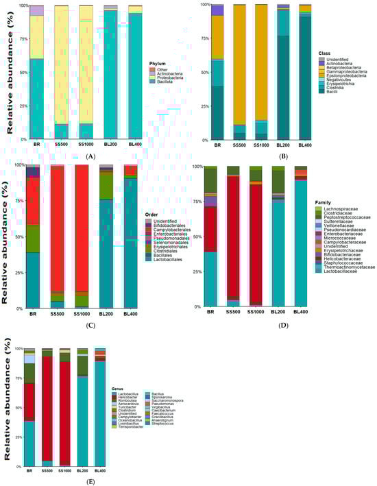 Treatment-wise relative abundance of the gut microbiota (phylum to genus). Panels (A–E) show stacked relative abundances (means across replicates) at phylum, class, order, family, and genus levels, respectively. Treatments: BR = basal ration; SS500/SS1000 = single-strain probiotic at 500/1000 g·t−1; BL200/BL400 = probiotic blend at 200/400 g·t−1. source: prepared by the authors.