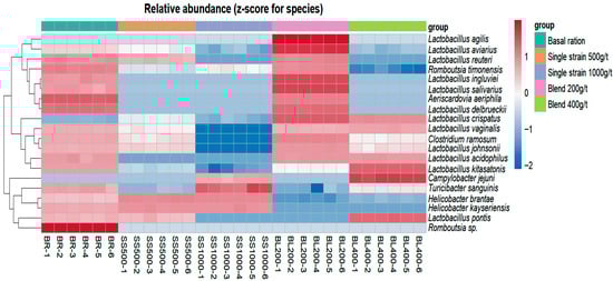 The bacterial species identified in the gut of laying hens are shown in Figure 3, which presents a heatmap of the relative abundance (expressed as z-scores per species) and hierarchical clustering of samples. Each column represents an individual sample within each treatment, and the clustering pattern reflects similarities in microbial composition among treatments.