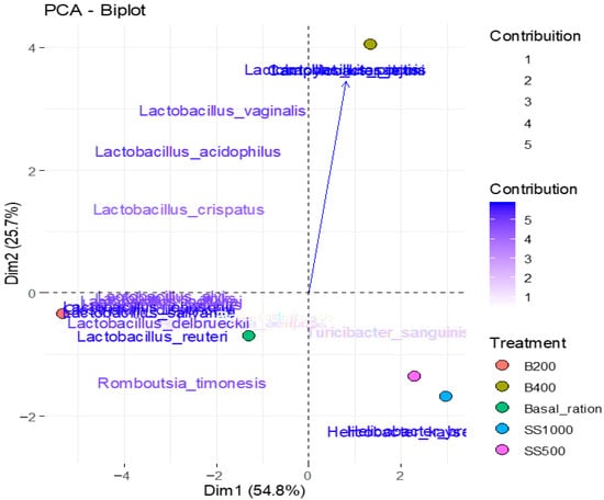 The graph shown in Figure 4 presents the distribution of samples along the first two principal components (PC1 and PC2), which together explain 80.46% of the total variance in the data. Component 1 (horizontal axis) separated samples associated with Lactobacillus species, Clostridium disporicum, and Romboutsia timonensis, which exhibited strong negative correlations. Component 2 (vertical axis) differentiated treatments with higher abundances of Lactobacillus kitasatonis, Campylobacter jejuni, and Lactobacillus pontis, species that were strongly positively correlated.