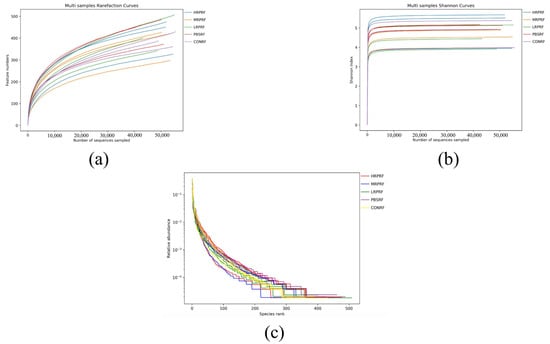 Alpha diversity analysis of rumen microorganisms. (a) The number of features was observed to vary with sequencing depth (rarefaction curve). (b) It was observed that more species were found as the sequencing volume increased until the species volume saturated (Shannon index). (c) Relative distribution of species abundance (rank abundance curve). CON = feeding only the basal diet; PBM (PBS) = basic diet and photosynthetic bacteria culture medium liquid; LRP = base diet supplemented with low R. palustris; MRP = base diet supplemented with medium R. palustris; HRP = base diet supplemented with high R. palustris; RF = rumen fluid.