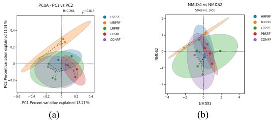 Beta diversity refers to the variation in species composition between different communities along an environmental gradient, with greater distances between samples indicating greater divergence. PCoA analysis visually displays the bacterial community differences between control and experimental samples. The Bray–Jaccard distance algorithm was employed, and ANOSIM analysis was used for intergroup difference testing. PCoA analysis revealed a significant grouping effect (R2 = 0.264, p = 0.015), indicating that 13.27% and 11.91% of the variance were explained by PC1 and PC2, respectively, with statistically significant differences between groups (Figure 4a). NMDS analysis revealed differences in species composition between the control and experimental groups. A stress value of 0.1573 indicates reliable dimensionality reduction in the NMDS analysis, with the plot effectively reflecting differences in the original data (Figure 4b). Both analytical methods consistently revealed a distinct clustering tendency among samples from different treatment groups, confirming significant differences in microbial community structure between the HPPRF, MRPRF, LRPRF, PBSRF, and CONRF groups.