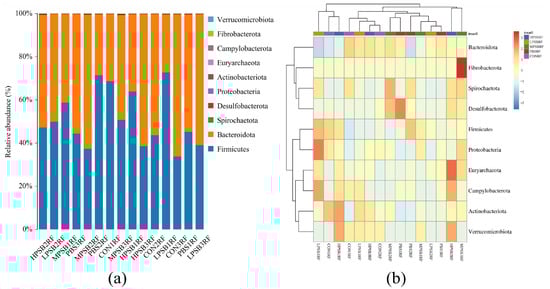 Rumen microbial composition at the phylum level. (a) Bar chart displaying taxonomic abundance. (b) Clustered heatmap of abundance profiles. CON = feeding only the basal diet; PBM (PBS) = basic diet and photosynthetic bacteria culture medium liquid; LRP = base diet supplemented with low R. palustris; MRP = base diet supplemented with medium R. palustris; HRP = base diet supplemented with high R. palustris; RF = rumen fluid.