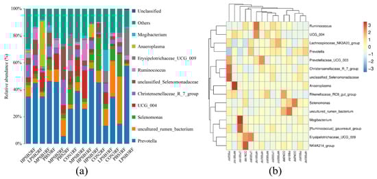 Relative abundance of rumen at the genus level. (a) Bar chart of species abundance at the genus level. (b) Cluster heatmap of genus-level abundance. CON = feeding only the basal diet; PBM (PBS) = basic diet and photosynthetic bacteria culture medium liquid; LRP = base diet supplemented with low R. palustris; MRP = base diet supplemented with medium R. palustris; HRP = base diet supplemented with high R. palustris; RF = rumen fluid.