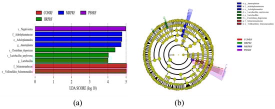 As shown in Figure 7a, after screening with a linear discriminant analysis (LDA) threshold greater than 4, the main bacterial groups exhibiting significant differences in abundance in the rumen included f_Acholeplasmataceae, f_Selenomonadaceae, s_Clostridium_disporicum, and nine other groups. Compared to the CONRF group and the PBMRF group, the MRPRF and HRPRF groups had a higher number of significantly different bacterial groups. As shown in Figure 7b, the key microbial groups in the CONRF group were o_Vellionellales_Selenomonadales and f_Selenomonadaceae. In contrast, the key microbial groups in the MRPRF and HRPRF groups were g_Anaeroplasma and s_Lactobacillus amylovorus, among others. Compared to the CONRF group, the MRPRF and HRPRF groups exhibited a higher number of significantly contributing microbial groups.