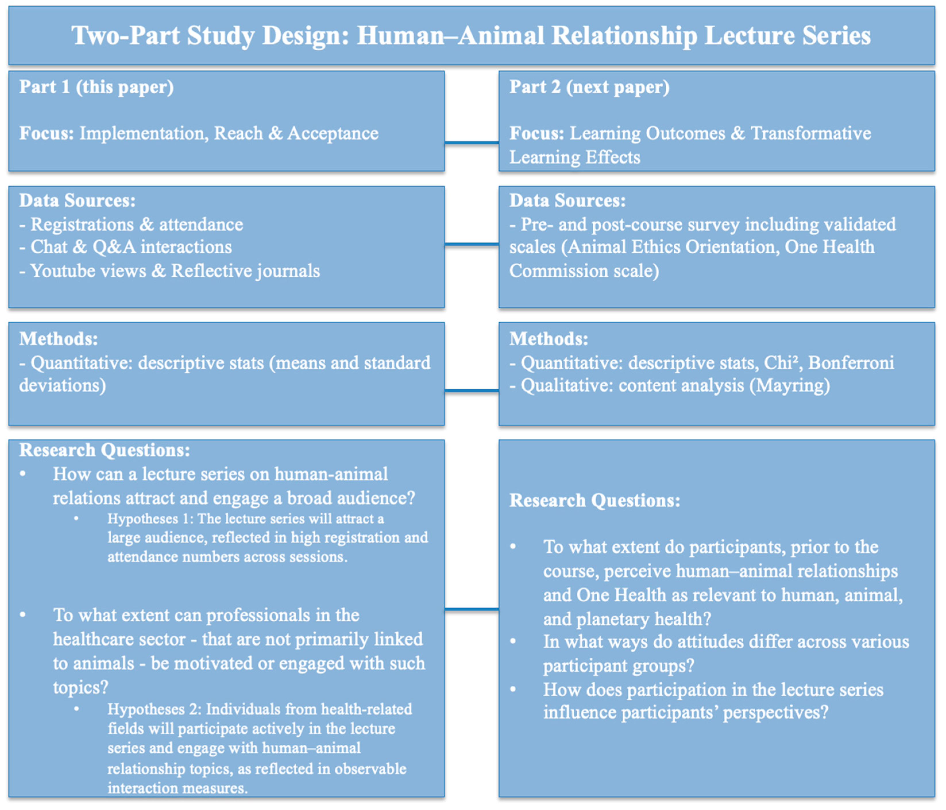 This manuscript reports on the development and implementation of the lecture series “Human–Animal Relationship”, offered at UW/H as an educational format open to both internal students and external participants, including students from other universities and members of the general public. Organized and moderated by three faculty members, the series spanned four months and featured weekly expert-led lectures, a Barcamp workshop, and a film screening. The event was conducted digitally via Zoom and accompanied by a scientific evaluation aimed at assessing its effectiveness in terms of knowledge acquisition and changes in participant perspectives. A mixed-methods approach was used to collect a wide range of data. In this manuscript, the focus was put on the quantitative findings, including participation numbers and registrations, interaction behaviour (chat and Q&A messages), live poll engagement, YouTube view counts, submitted learning journals, and issued certificates of achievement or participation.