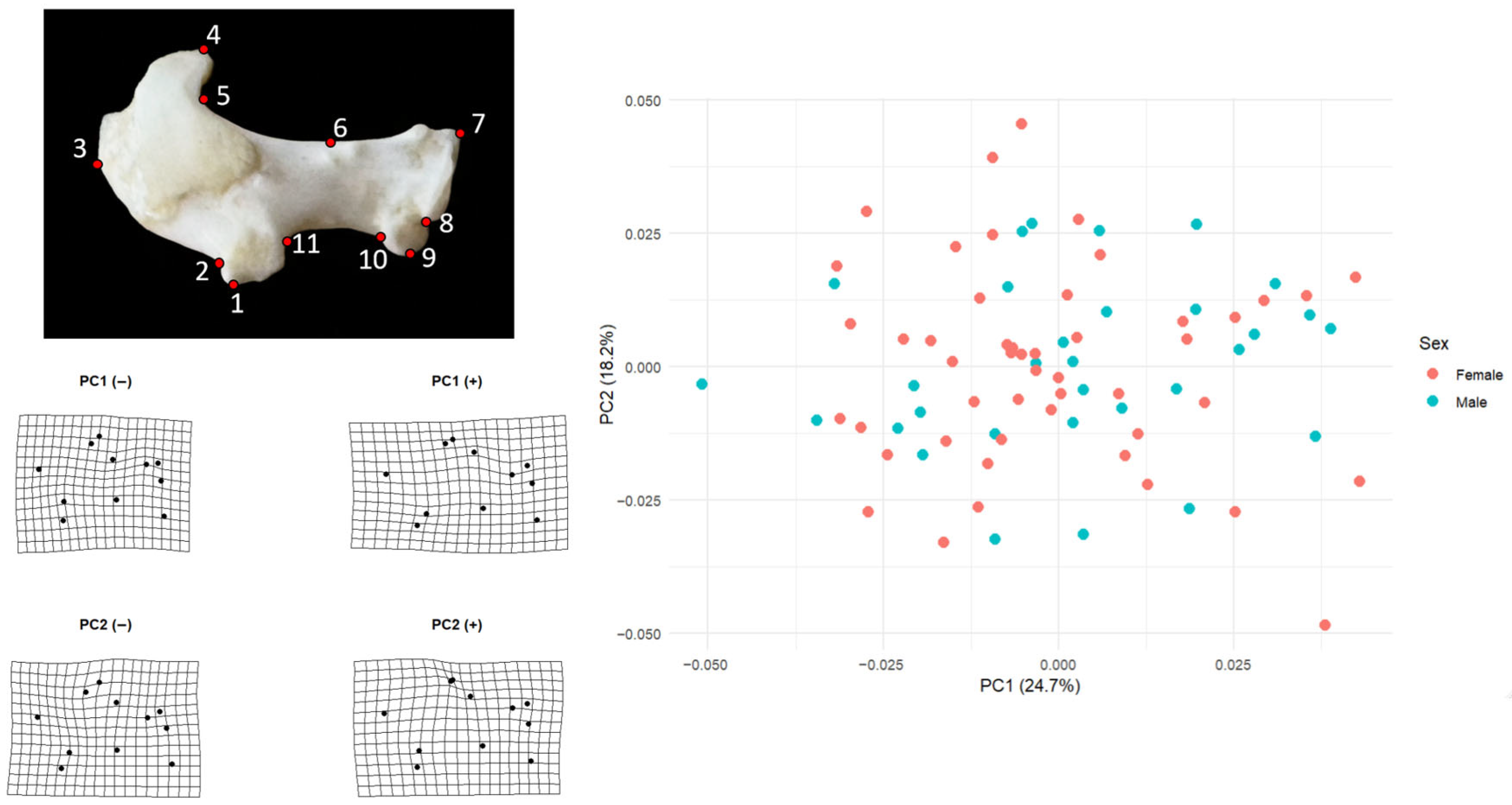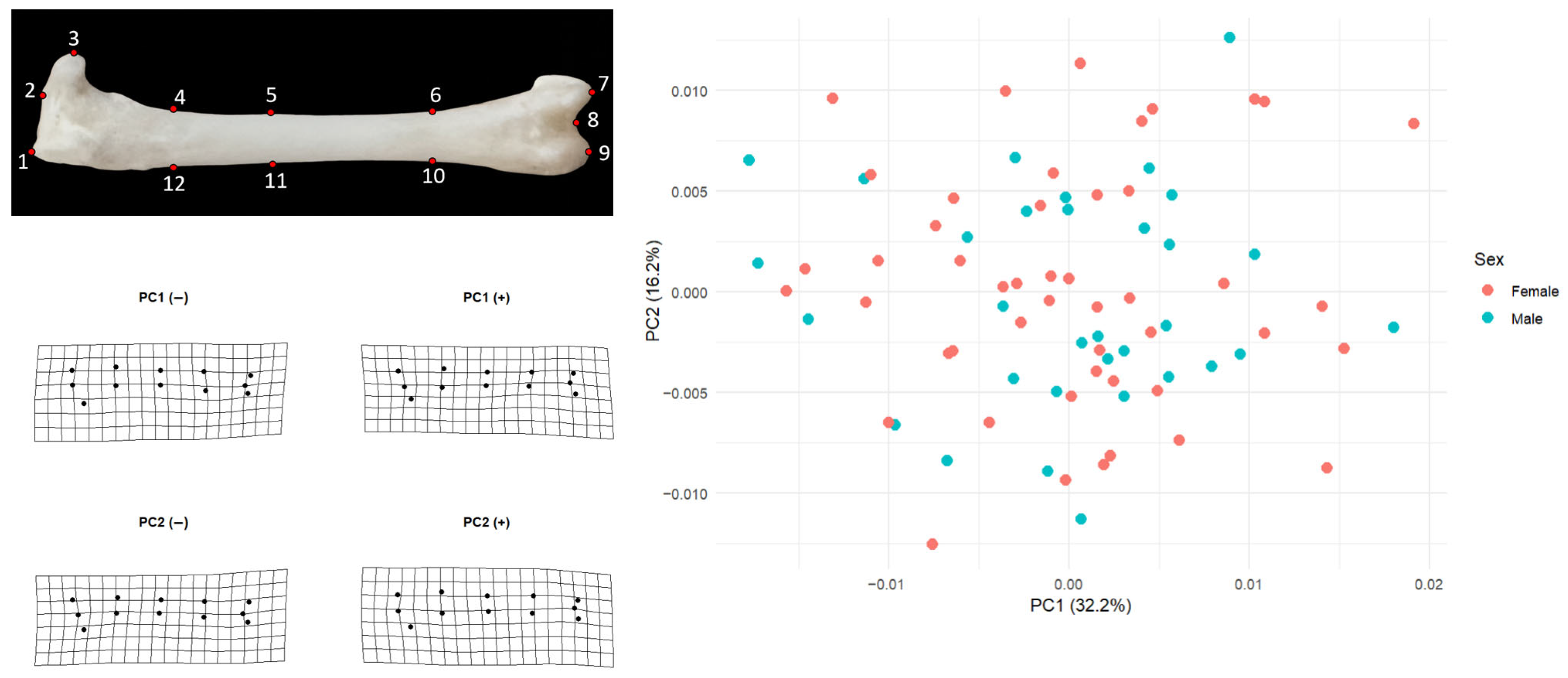24]. Landmark coordinates for the humerus (11 landmarks) and femur (12 landmarks) were first imported from TPS files and subjected to a Generalized Procrustes Analysis to remove the effects of translation, rotation, and scale; this step produced Procrustes-aligned shape coordinates and centroid size (CS) for each specimen. To characterize the main axes of shape variation, separate principal component analyses (PCA) were then performed for the humerus and the femur. The distribution of specimens in PC1–PC2 space was plotted and color-coded by sex in order to visually assess whether males and females occupied different regions of morphospace, and deformation grids at the extremes of the PCs were inspected to interpret which anatomical regions contributed most to shape change.