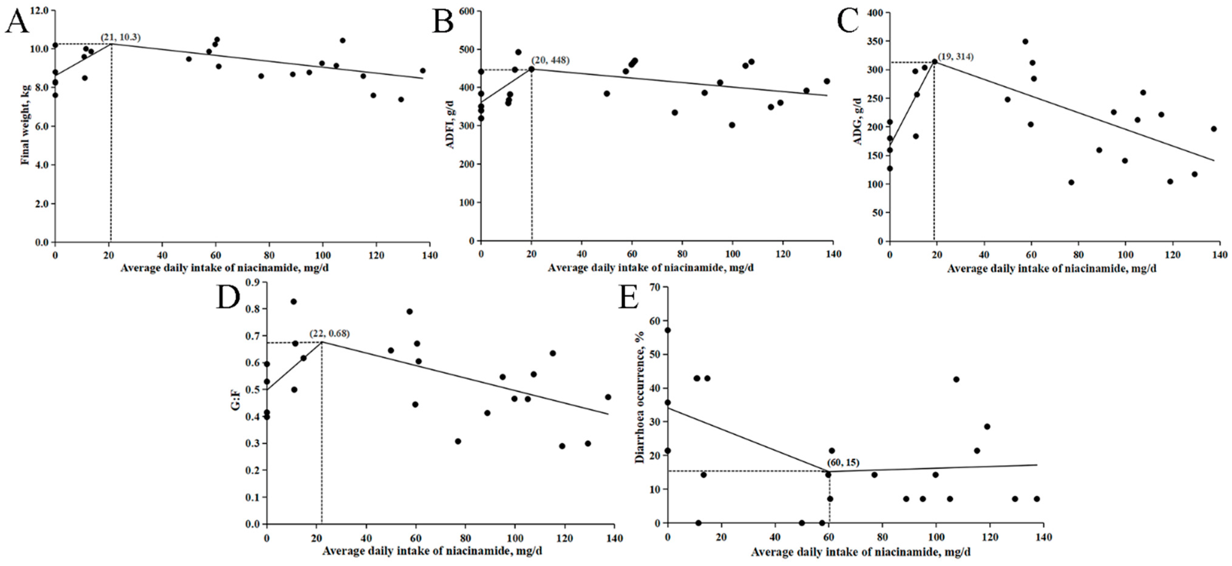 The relationship between these response variables and daily niacinamide intake is shown in Figure 1. The estimated optimal intakes for achieving maximum BW on d 14, ADFI, ADG, G:F, and minimum diarrhea occurrence were 21, 20, 19, 22, and 60 mg/d, respectively. Based on the predicted ADFI values from the intake–response model (Figure 1B), these optimal intakes correspond to approximate dietary concentrations of 47, 43, 45, 49, and 140 mg/kg of niacinamide.