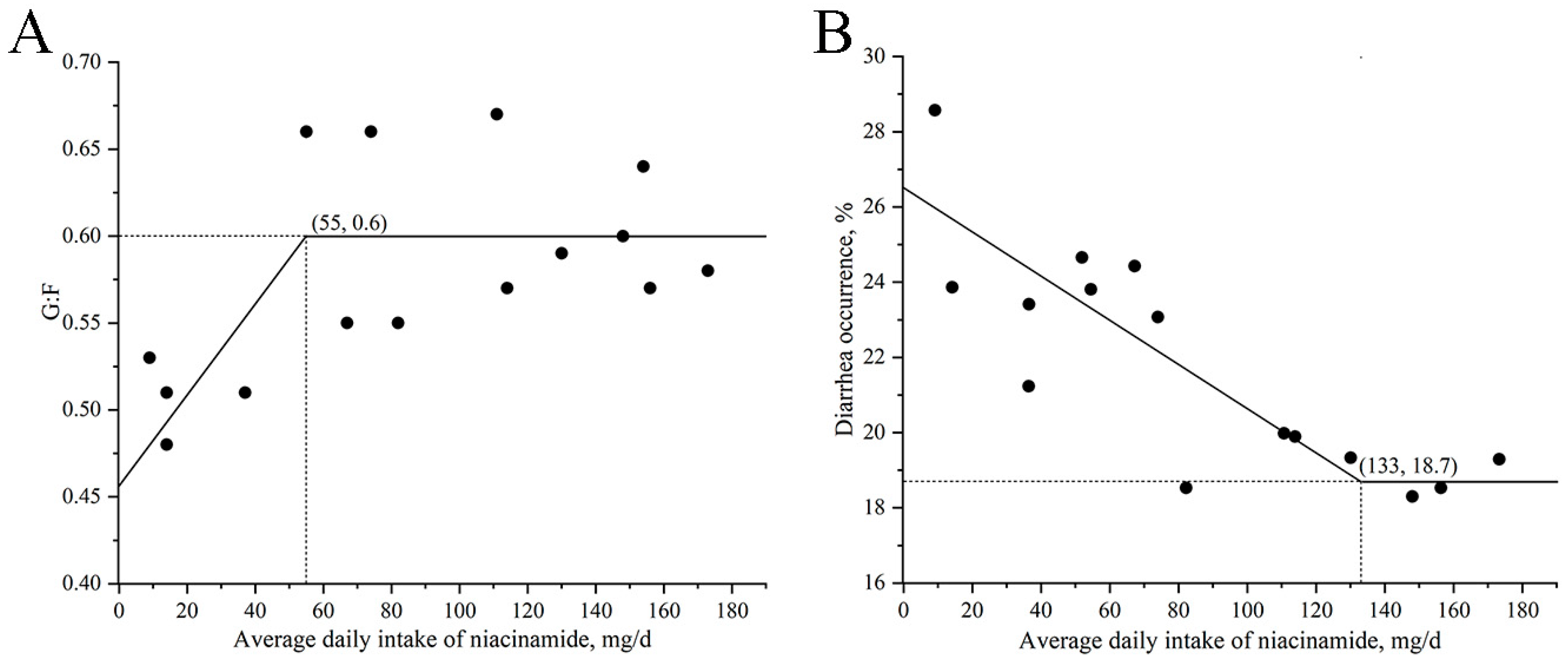 The relationship between daily niacinamide intake and both G:F and diarrhea occurrence is shown in Figure 2. The maximum G:F was observed at a daily intake of 55 mg, corresponding to an estimated dietary concentration of 130 mg/kg niacinamide. Meanwhile, the lowest diarrhea occurrence was at a daily intake of 133 mg/d, equivalent to approximately 314 mg/kg of dietary niacinamide. As ADFI did not differ significantly among treatments in Exp. 2, the estimated dietary niacinamide concentrations were calculated based on the overall average feed intake (424 g/d) across all groups rather than derived from regression models.