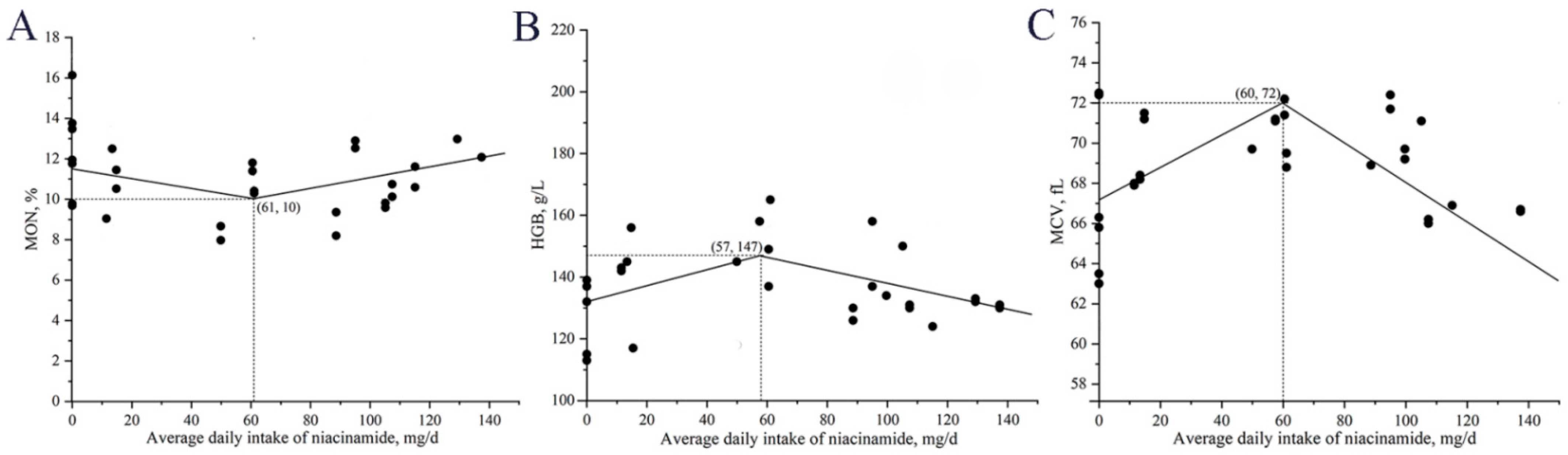 The relationship between daily niacinamide intake and MON, HGB, and MCV are illustrated in Figure 3. The minimum MON was observed at a daily intake of 61 mg, the maximum HGB was observed at a daily intake of 57 mg, the maximum MCV was observed at a daily intake of 60 mg, corresponding to an estimated dietary concentration of approximately 140 mg/kg niacinamide.